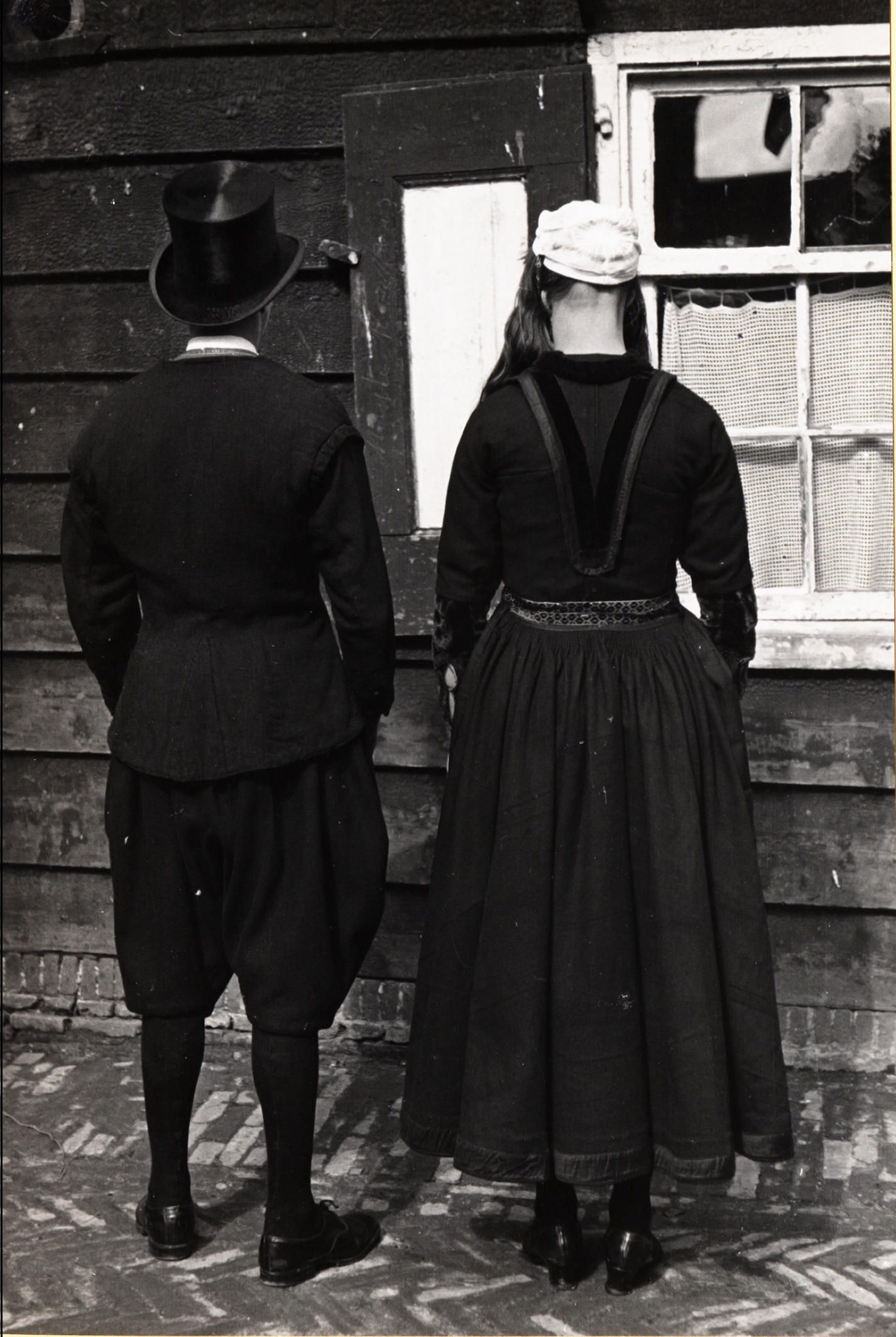 Ariaan Zondervan en Maritje Pereboom, verkleed in bruidskleding, Marken, 1945 (zwart-wit foto)