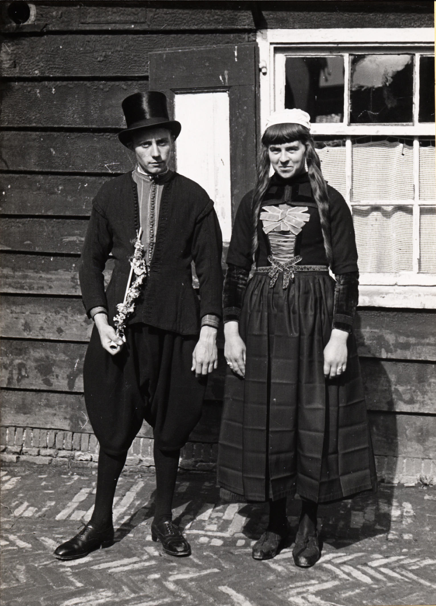 Ariaan Zondervan en Maritje Dirk Pereboom, verkleed in bruidskleding ter gelegenheid van deelname aan een optocht waarbij een Marker bruiloft werd uitgebeeld. Deze optocht vond plaats op vrijdag 31 augustus 1945 vanwege Koninginnedag. Ariaan en Maritje dragen de dracht van het bruidspaar op de huwelijksdag.