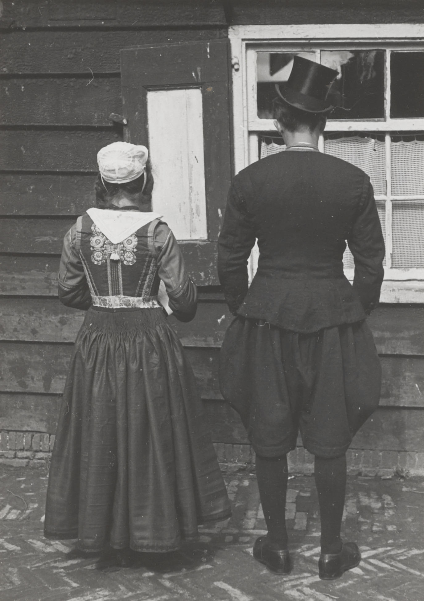 Annetje de Waart en Pieter Stooker, verkleed in bruidskleding ter gelegenheid van deelname aan een optocht waarbij een Marker bruiloft werd uitgebeeld. Deze optocht vond plaats op vrijdag 31 augustus 1945 vanwege Koninginnedag. Annetje en Pieter dragen de dracht van de 'Rode bruid en bruidegom ter kerke', 's ochtends op de 'tussenzondag' tussen het 'aantekenen' ...