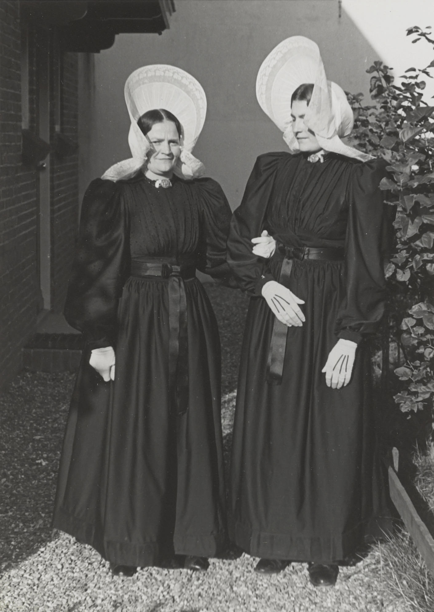 Twee vrouwen in streekdracht uit Huizen. Ze zijn gekleed als bruiloftsgasten. Op hun hoofden dragen ze de oorijzermuts.