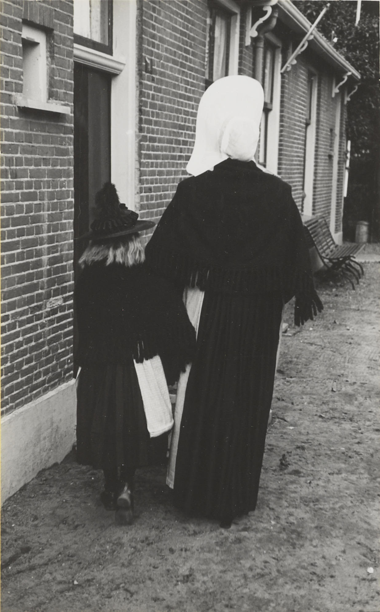 Vrouw en meisje in streekdracht, Huizen, 1945 (zwart-wit foto)