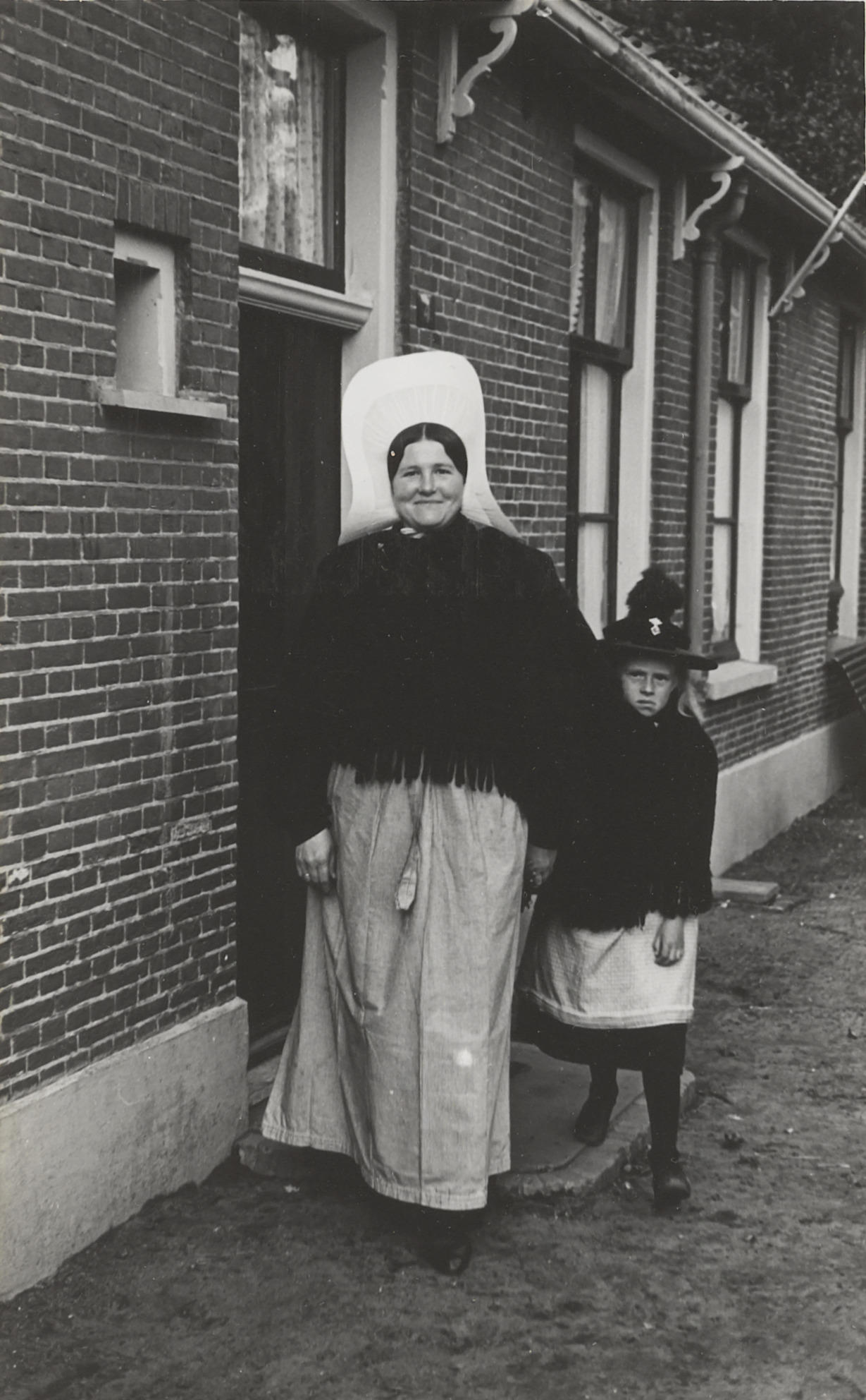 Vrouw en meisje in streekdracht, Huizen, 1945 (zwart-wit foto)