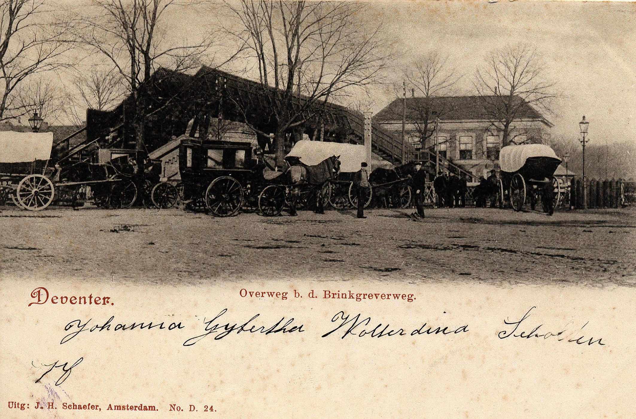 Voetbrug over de spoorlijn bij de Brinkgreverweg in Deventer. De brug naar station HYSM (Hollandsche IJzeren Spoorweg-Maatschappij) was een houten voetbrug, de zogenoemde 'hoge brug'. Tussen de stations van het Staatsspoor en de HYSM konden de passagiers via deze brug makkelijker overstappen van de noord-zuidlijn (Zwolle-Deventer-Zutphen) naar de oost-westlijn (Almelo-Deventer-Apeldoorn). Op de achtergrond staat het ...