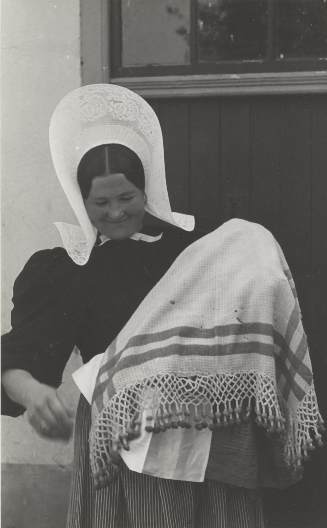 Vrouw in streekdracht uit Huizen met dopeling. Rond 1920 werd het kind op deze wijze naar de kerk gedragen voor de doopdienst. De vrouw is gekleed in opknapdracht.