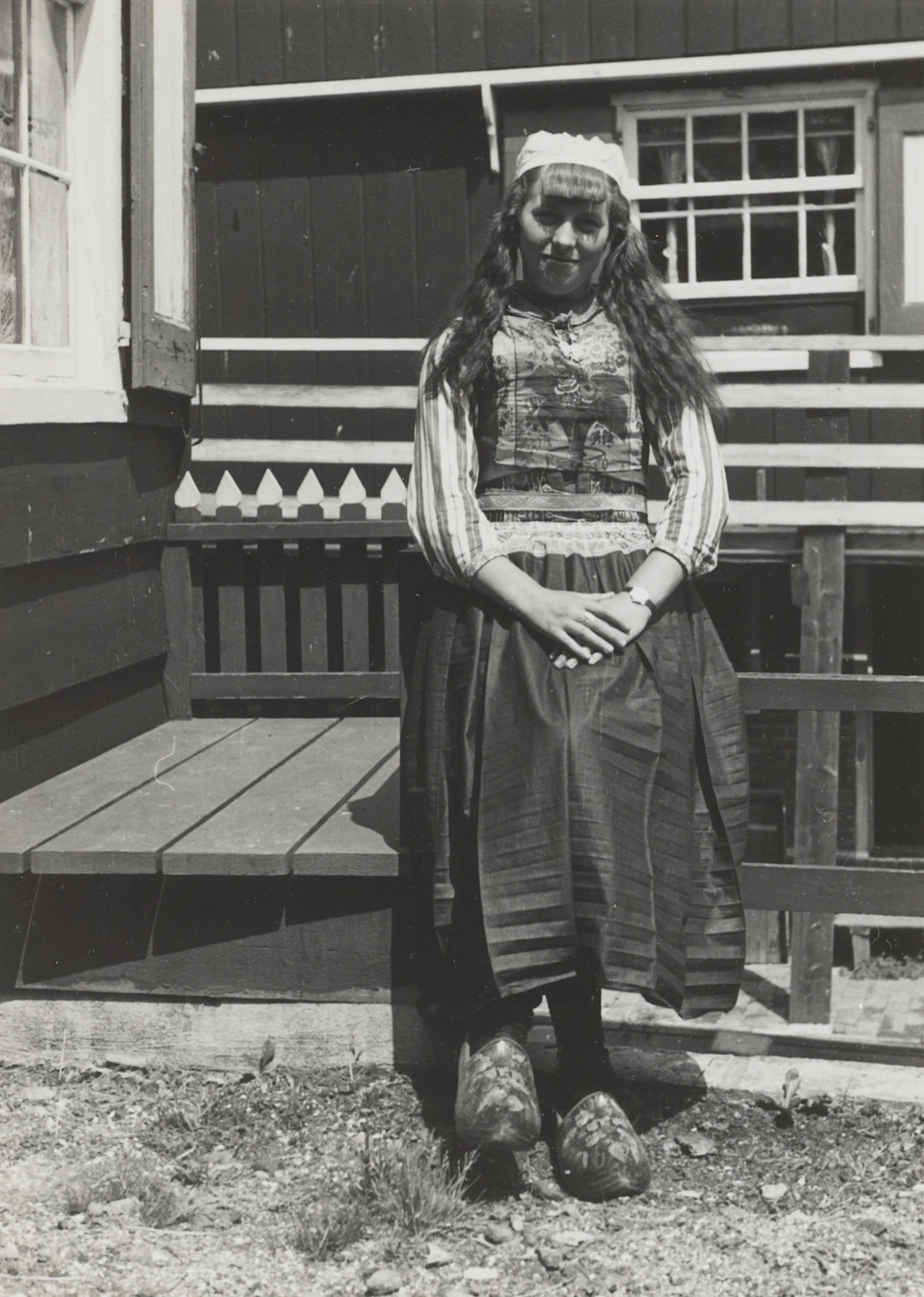 Lijsbeth Zondervan in Marker dracht, 1943 (zwart-wit foto)