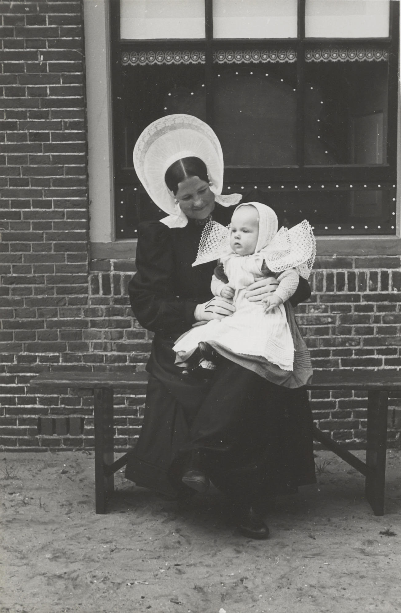 Vrouw en kind in streekdracht, Huizen, 1945 (zwart-wit foto)