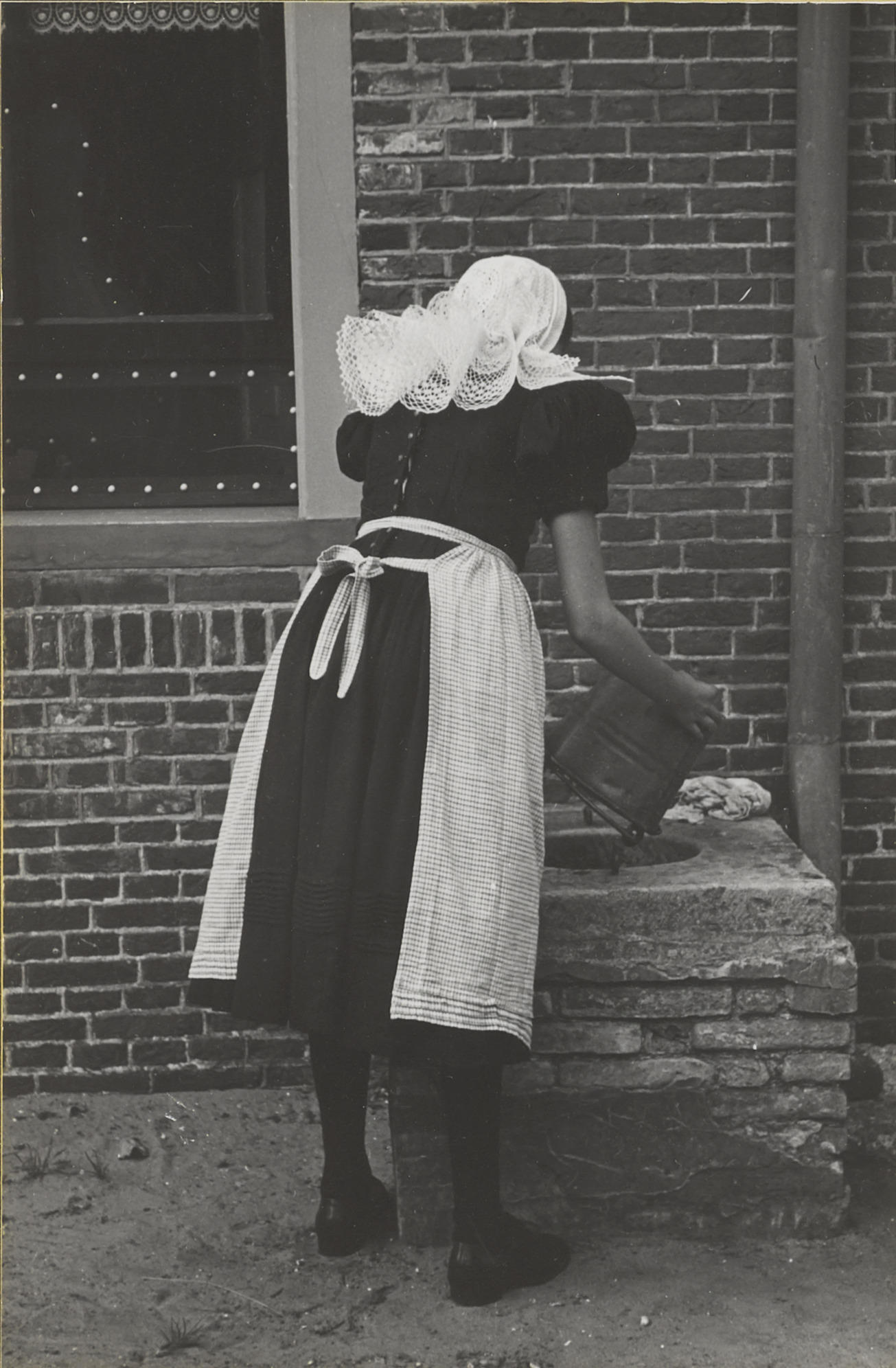 Meisje verkleed in streekdracht, Huizen, 1945 (zwart-wit foto)