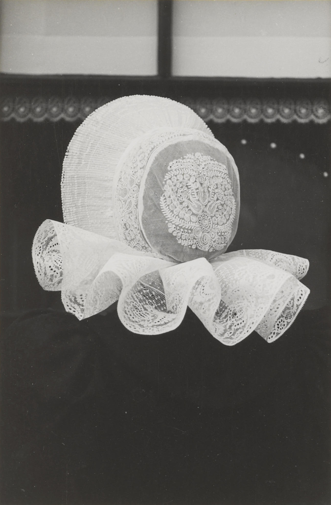 Meisje, verkleed in streekdracht uit Huizen. Ze draagt de zondagse dracht van omstreeks 1930 voor meisjes van 14-18 jaar, met de zogenoemde 'plooimuts'.