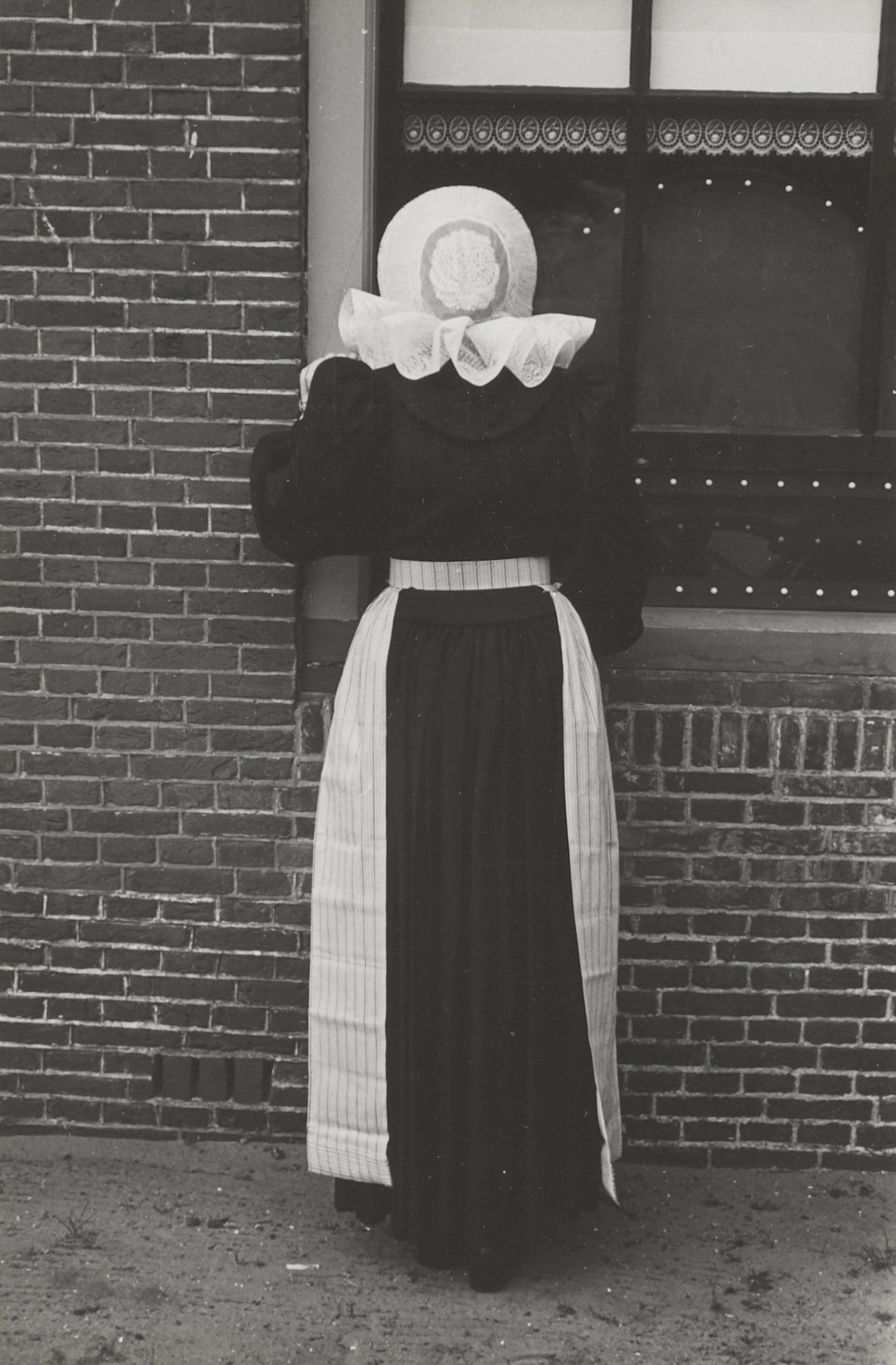 Meisje verkleed in streekdracht, Huizen, 1945 (zwart-wit foto)