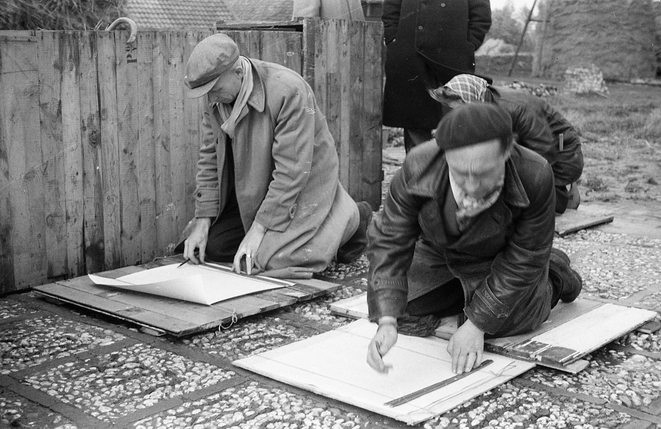 Het opmeten van een keitjesvloer door medewerkers van het Nederlands Openluchtmuseum. De keitjesvloer heeft het jaartal '1837' en de initialen 'LBTM' (Lambertus Tigchelman) en 'LBR' (Elisabet Roossink). De vloer lag in de boerderij 'Erve Wolferink' of 'De Stroombrink' in Geesteren. In 1942 werd de boerderij ernstig beschadigd. De keitjesvloer is in 1945 geschonken aan het ...