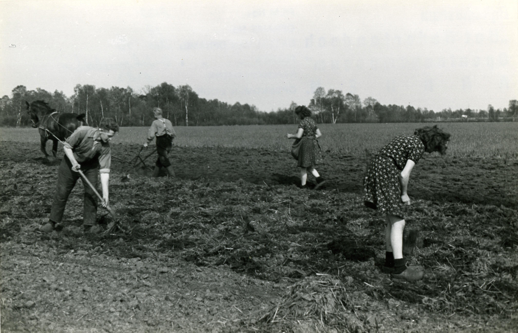 Ploegen, bemesten en aardappels poten, Oud Schoonebeek, 1946 (zwart-wit foto)