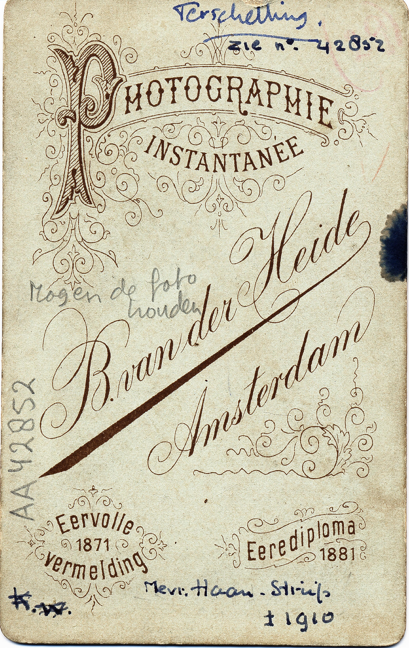Mevrouw Haan-Striep in Terschellinger streekdracht. Ze draagt de 'staartkap' (muts) over het oorijzer. Aan de uiteinden van het oorijzer zijn rechthoekige 'boeken' bevestigd die ter hoogte van het voorhoofd gedragen worden. Boven de 'boeken' zijn twee mutsspelden te zien waarmee de muts aan het oorijzer is bevestigd. Tussen de boeken en de mutsspelden zijn twee ...