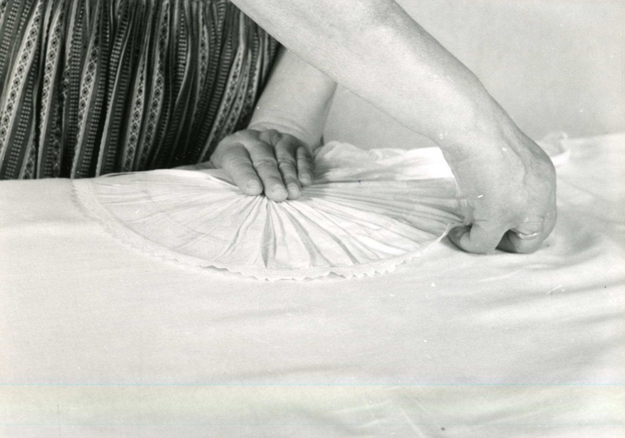 Demonstratie van het wassen en opmaken van een muts uit Nieuw- en Sint Joosland door mevrouw Theune-de Keuning uit Middelburg. Nadat de muts gewassen, gesteven en gedroogd is, gaat deze eerst door de glansstijfsel. Nadat de stijfseloplossing gelijkmatig in de hele muts is opgenomen, is het overschot van de oplossing uit de muts geperst. Eerst ...