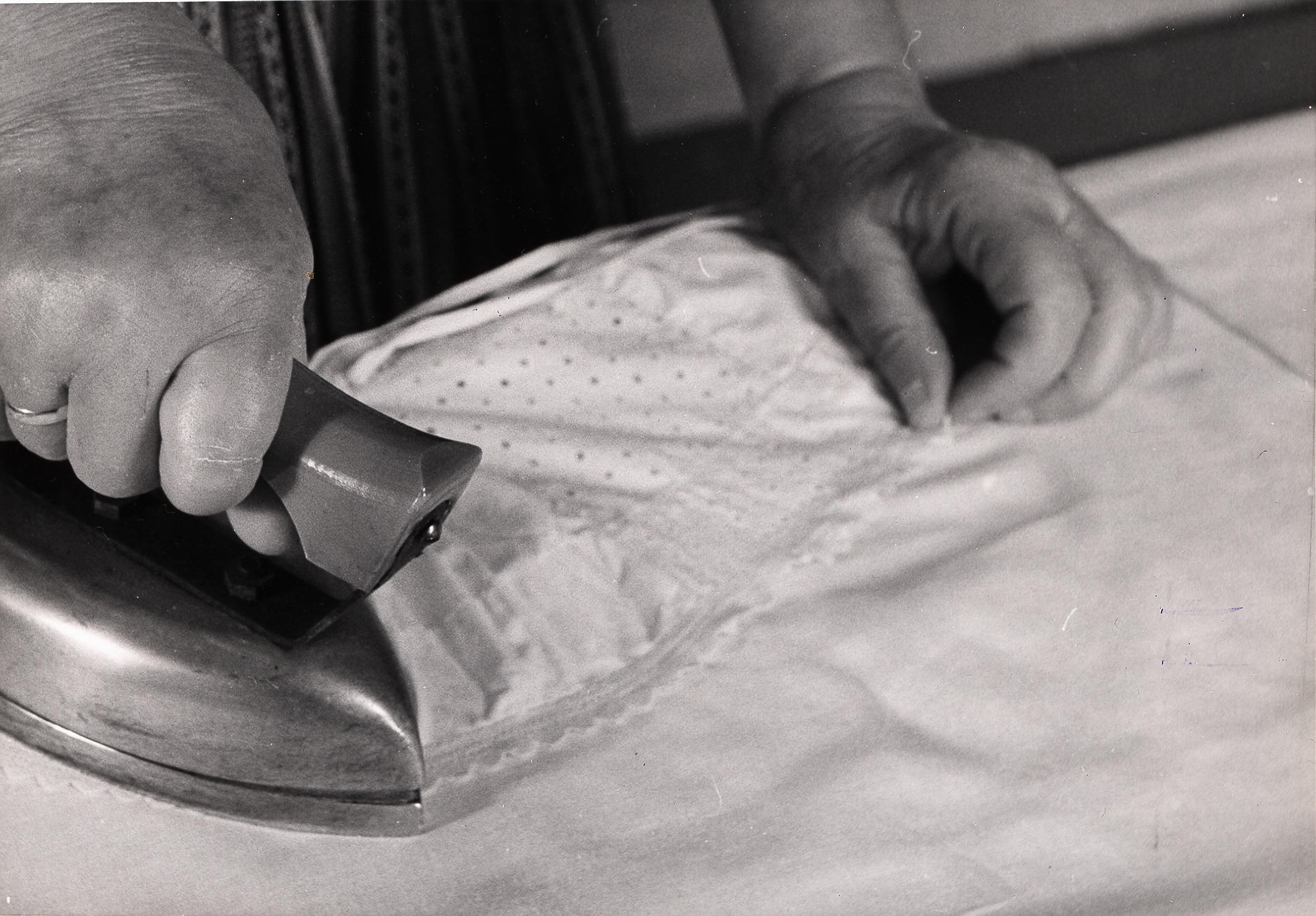 Demonstratie van het wassen en opmaken van een muts uit Nieuw- en Sint Joosland door mevrouw Theune-de Keuning uit Middelburg. Nadat de muts gewassen, gesteven en gedroogd is, gaat deze eerst door de glansstijfsel. Nadat de stijfseloplossing gelijkmatig in de hele muts is opgenomen, is het overschot van de oplossing uit de muts geperst. Eerst ...