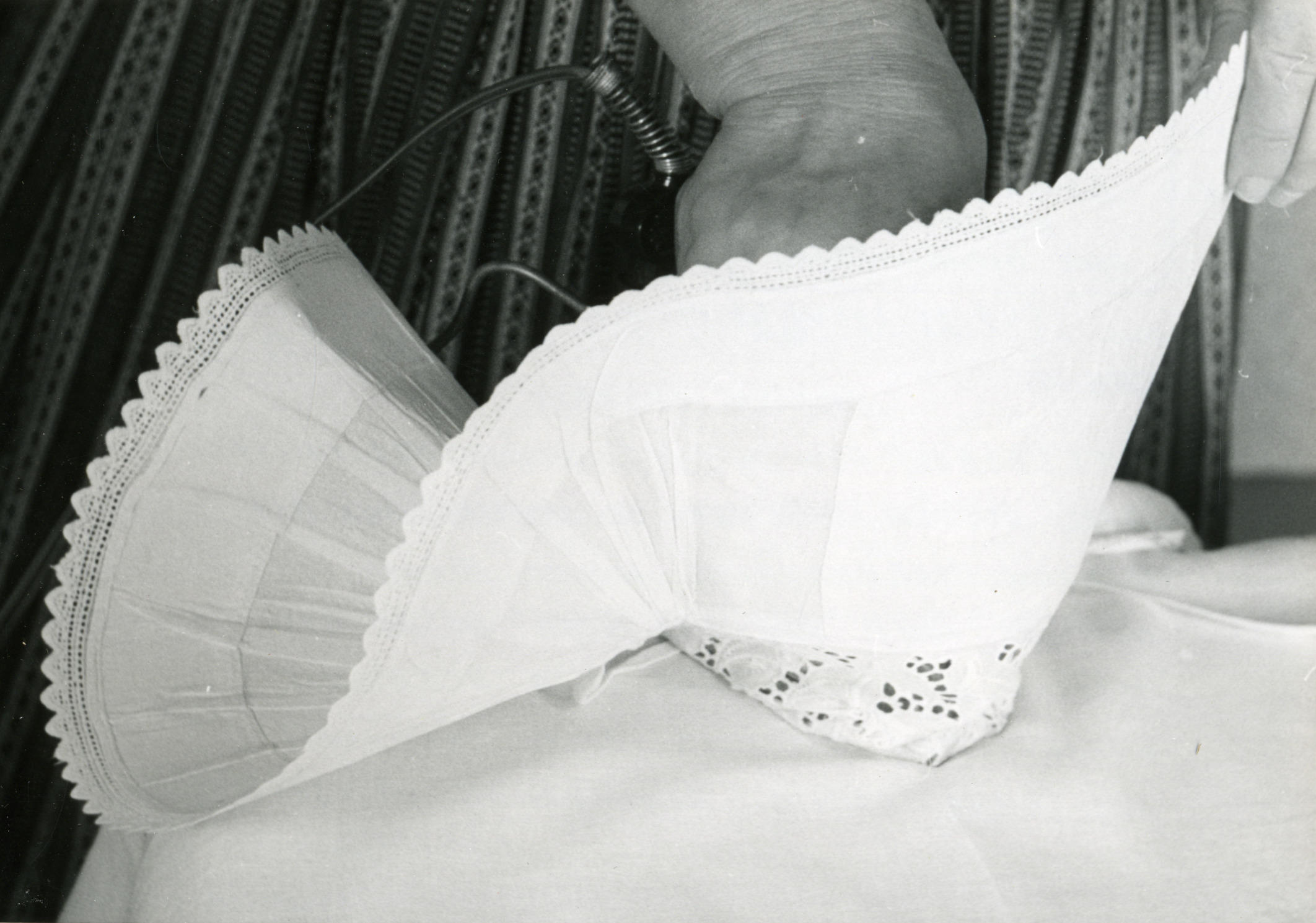 Demonstratie van het wassen en opmaken van een muts uit Nieuw- en Sint Joosland door mevrouw Theune-de Keuning uit Middelburg. Nadat de muts gewassen, gesteven en gedroogd is, gaat deze eerst door de glansstijfsel. Nadat de stijfseloplossing gelijkmatig in de hele muts is opgenomen, is het overschot van de oplossing uit de muts geperst. Eerst ...