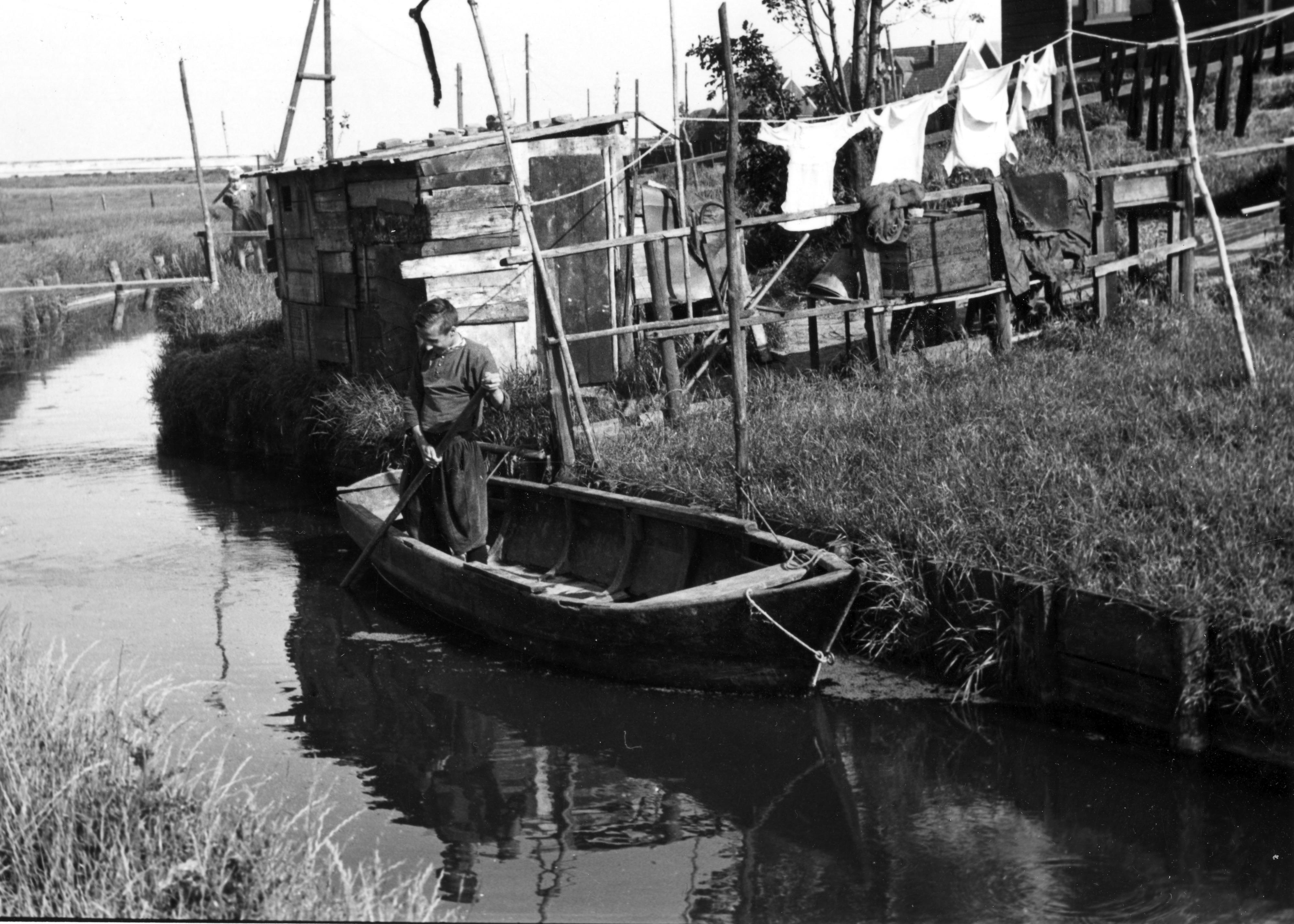 Jongen in roeiboot, Marken, 1943 (zwart-wit foto)
