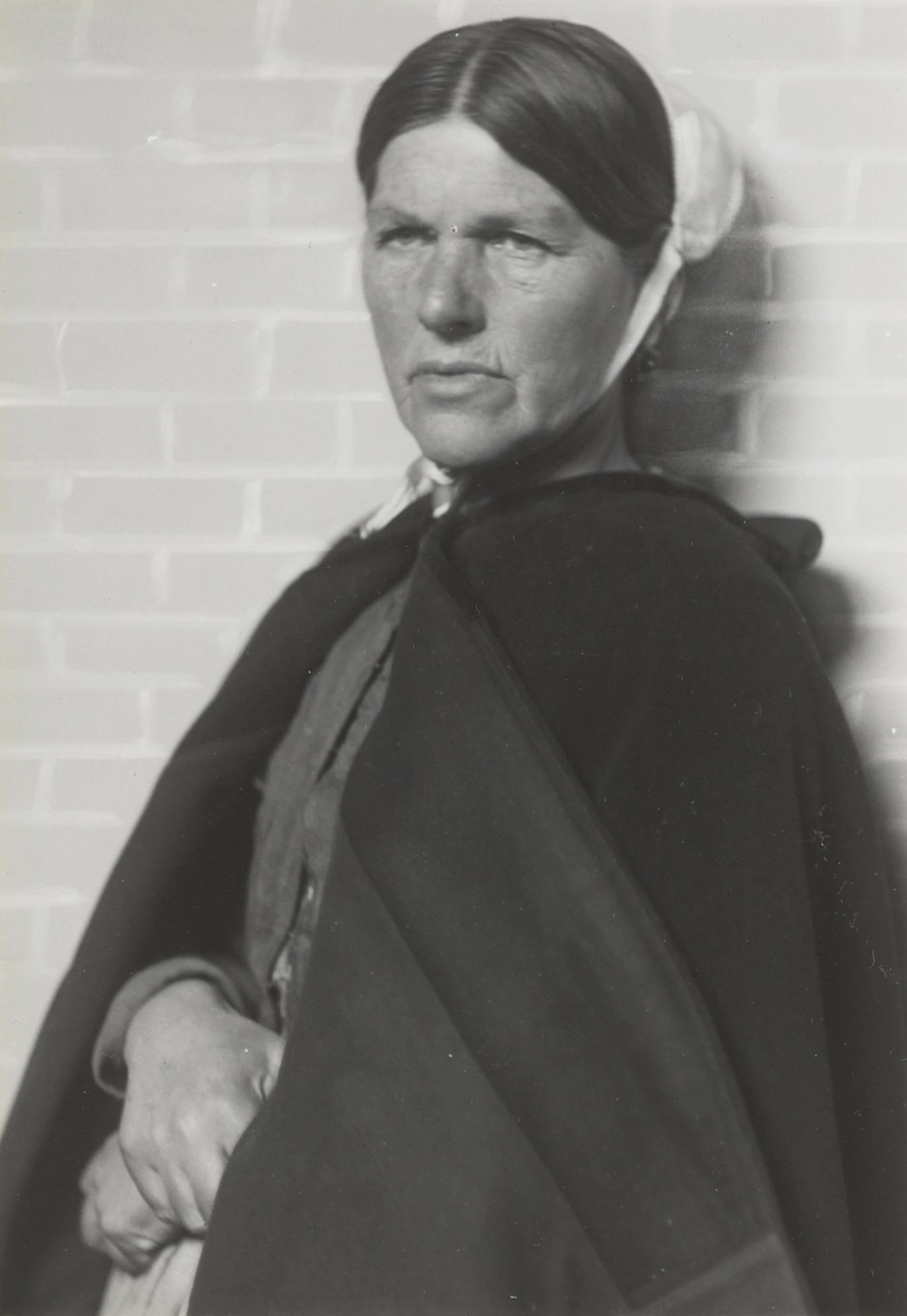 Vissersvrouw, gekleed in Scheveningse streekdracht. Ze is gekleed in de daagse of opknapdracht. Op het hoofd draagt ze het zogenoemde nachtmutsje. Ze heeft een schoudermantel omgeslagen.