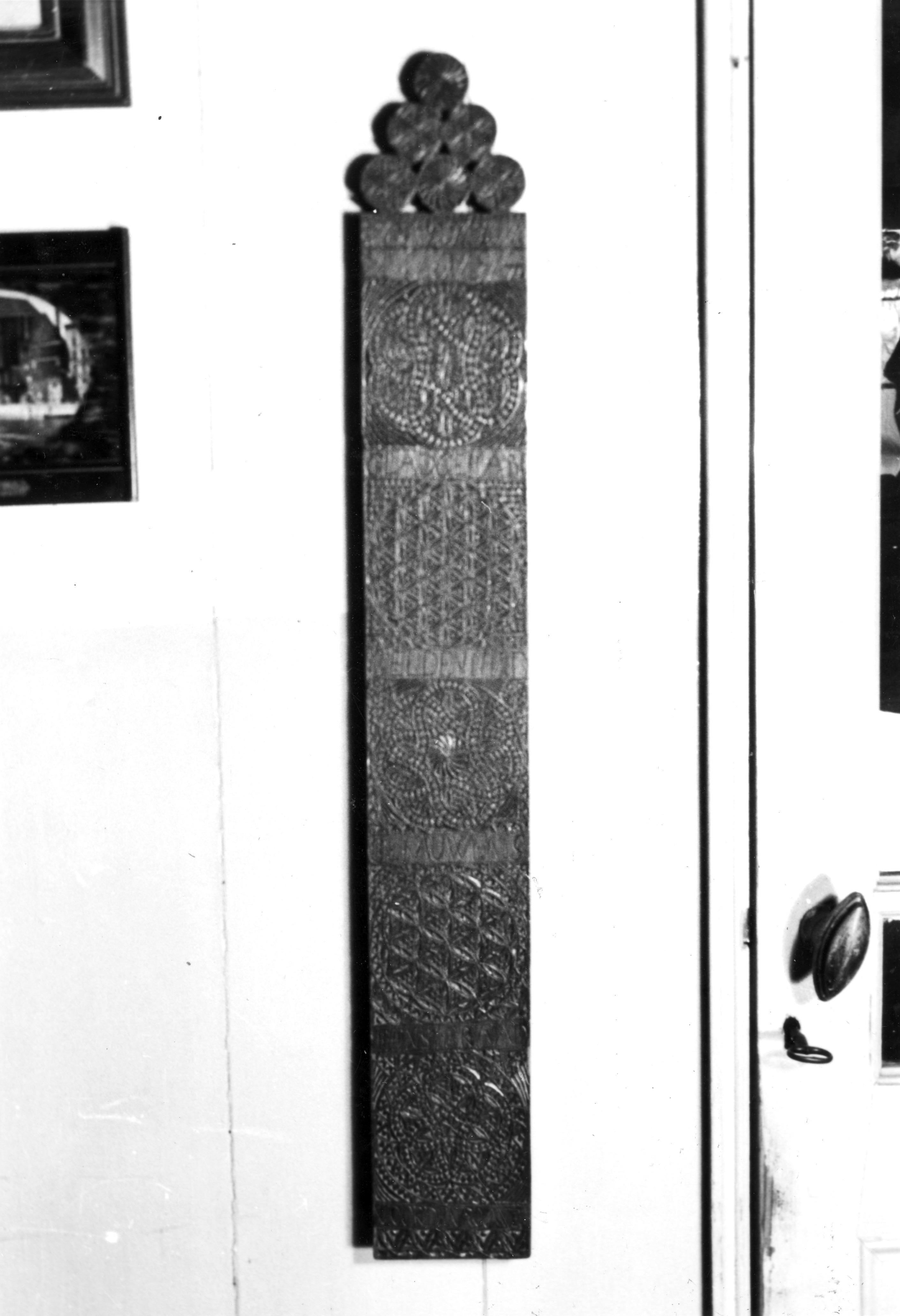 Houten mangelplank, versierd met kerfsneewerk, in een woning op Marken.