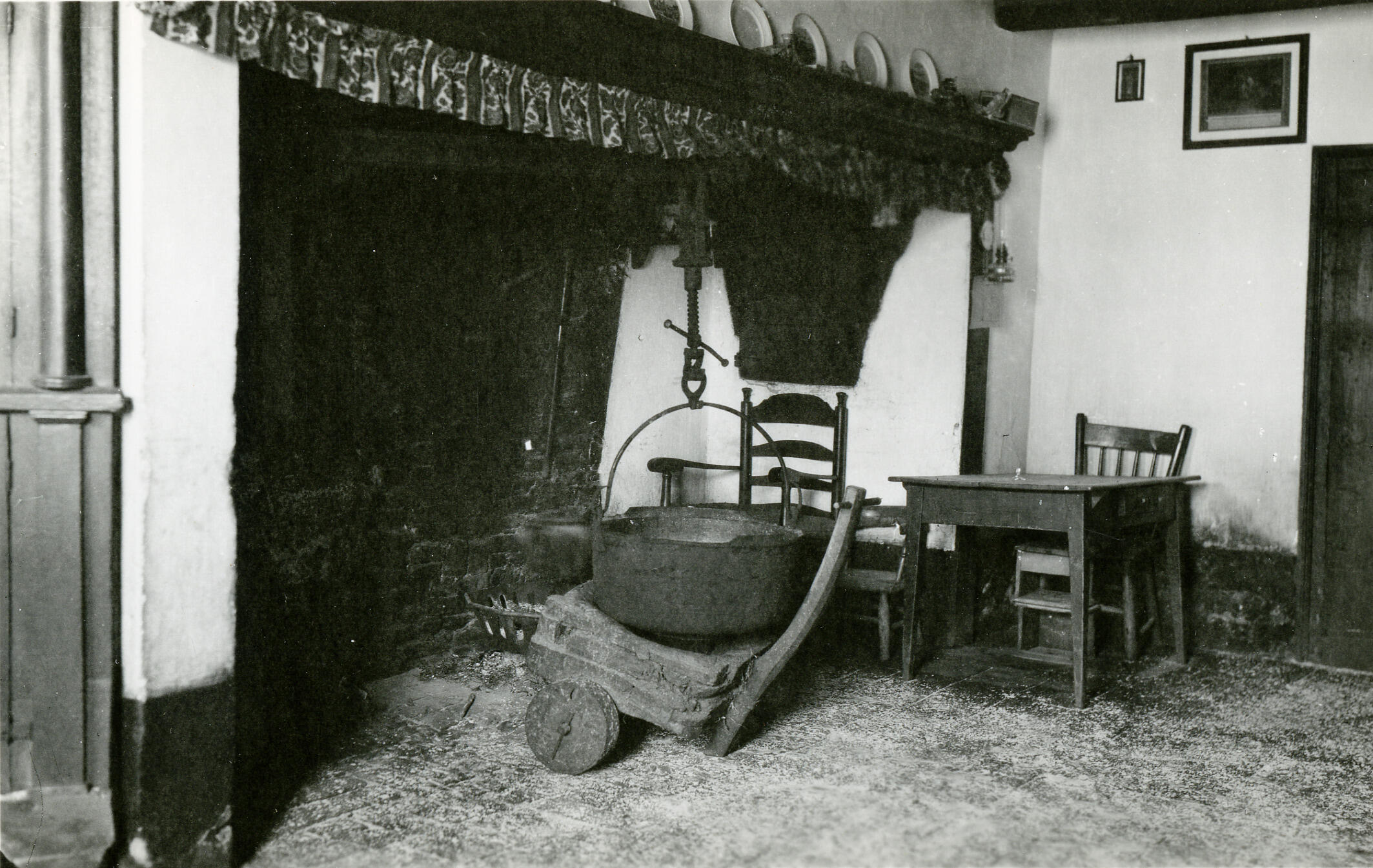 Een schouw in het woongedeelte van een boerderij in Middelbeers. Onder de schouw is plaats voor een open vuur. Langs de rand van de schouw hangt een schoorsteenval. Aan de schouw hangt een schroefhaal. Hieraan hangt een grote ijzeren kookpot die rust op een houten karretje. In de kookpot wordt voer voor de beesten gekookt, ...