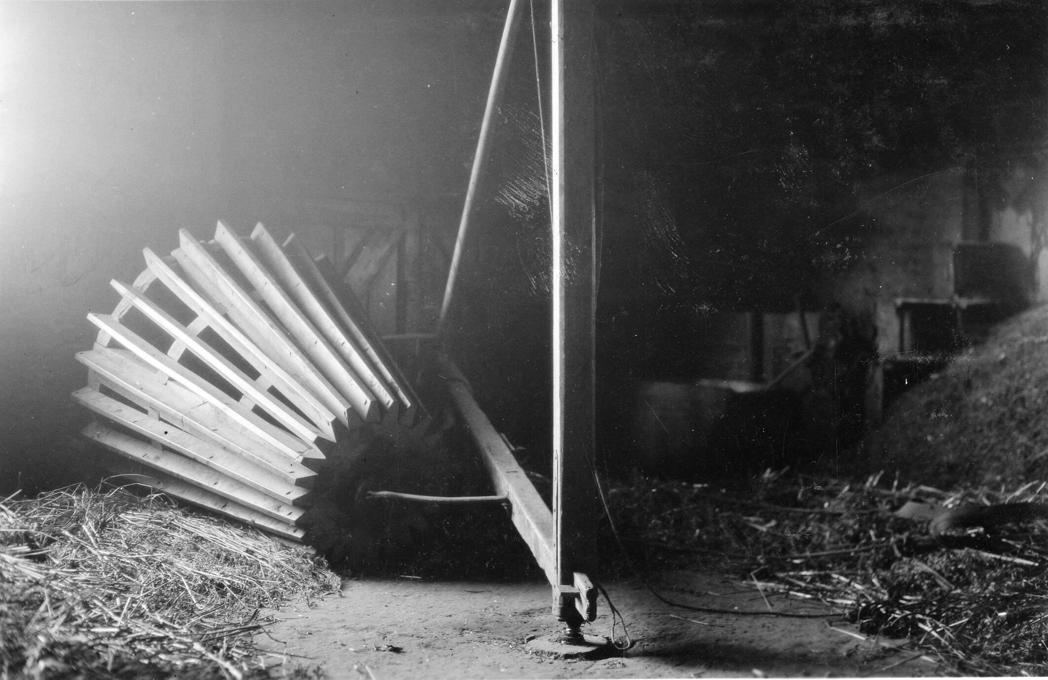 Een houten dorsrol, gebruikt voor het dorsen van graan, in een boerderij in Sint Annaparochie. De rol kan door een paard worden aangedreven.