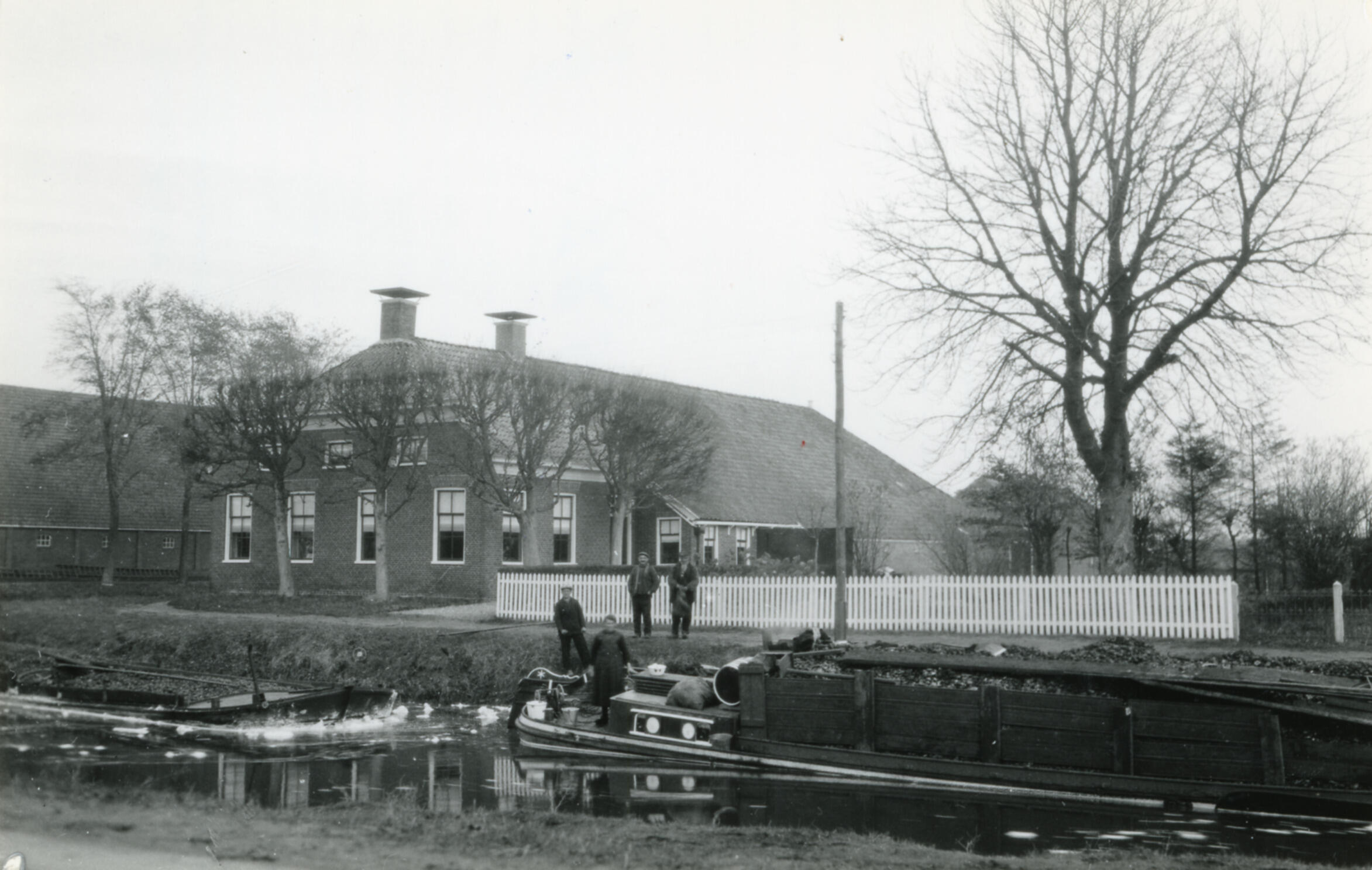 Een boerderij aan een kanaal in Bareveld, bij Veendam. Door het kanaal varen binnenvaartschepen.