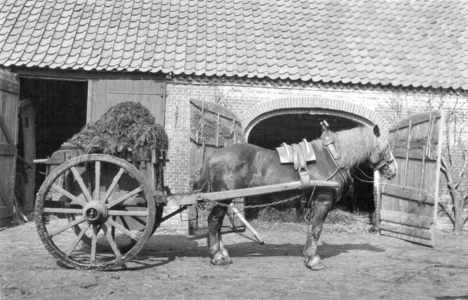 Een volgeladen mestkar met een paard, bij een boerderij in Oostelbeers. De koemest wordt uit de potstal op de kar geschept en naar het land gereden.