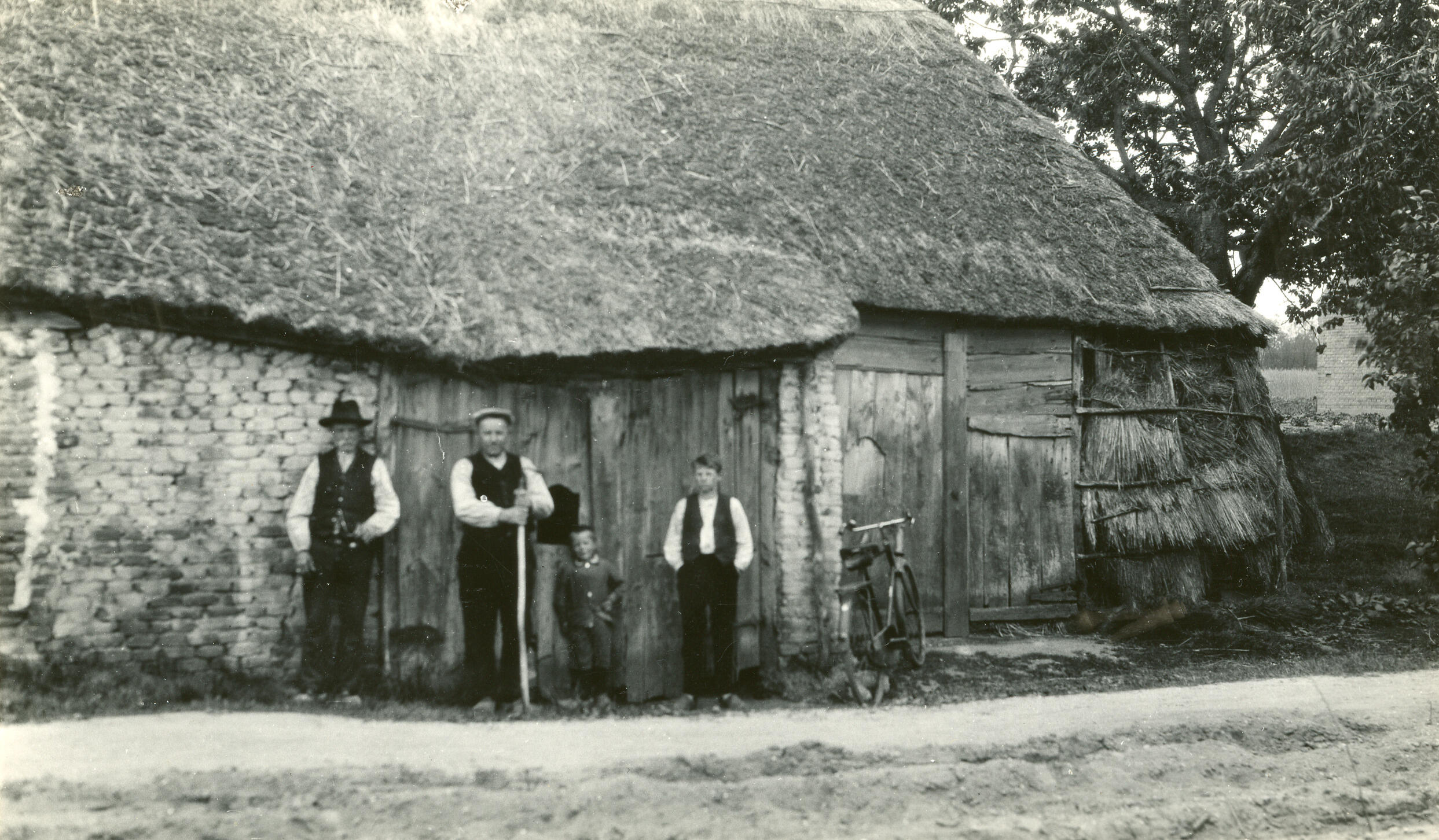 Zijgevel van een boerderij in Nistelrode. De wand rechts is van stro. Naast de boerderij staan twee mannen en twee jongens.