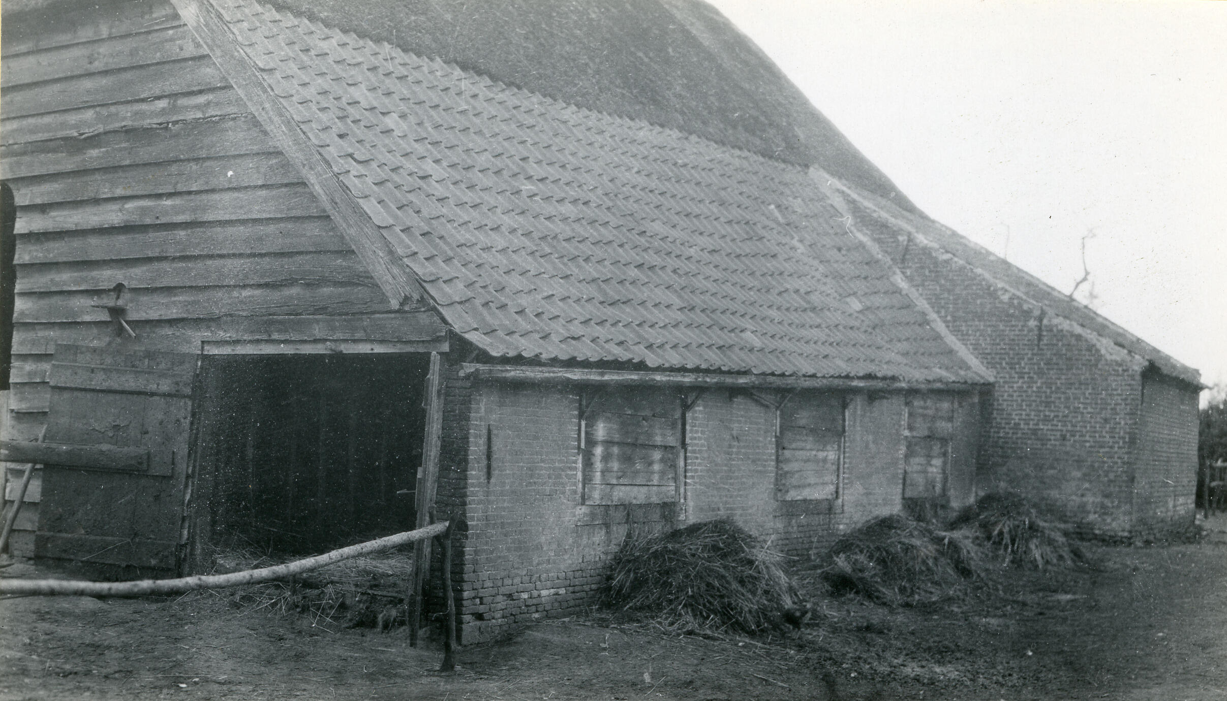 De achter- en zijgevel van de boerderij van de familie Adams in De Kraats. Langs de zijgevel liggen hopen mest. De achtergevel is van hout.