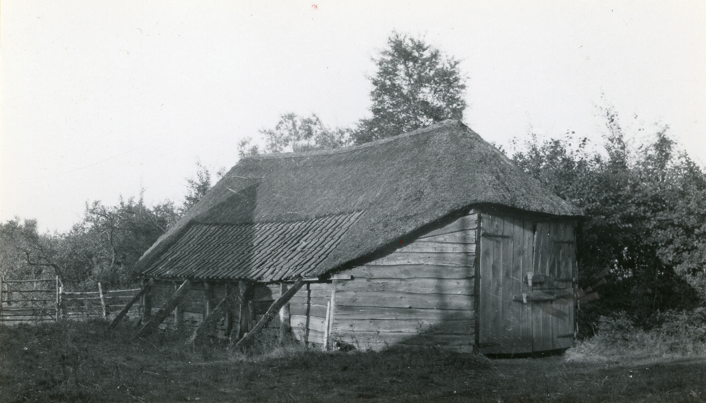 Schaapskooi bij de boerderij van de familie Adams in De Kraats. Het dak is deels met riet en deels met dakpannen gedekt. De wanden zijn van hout.