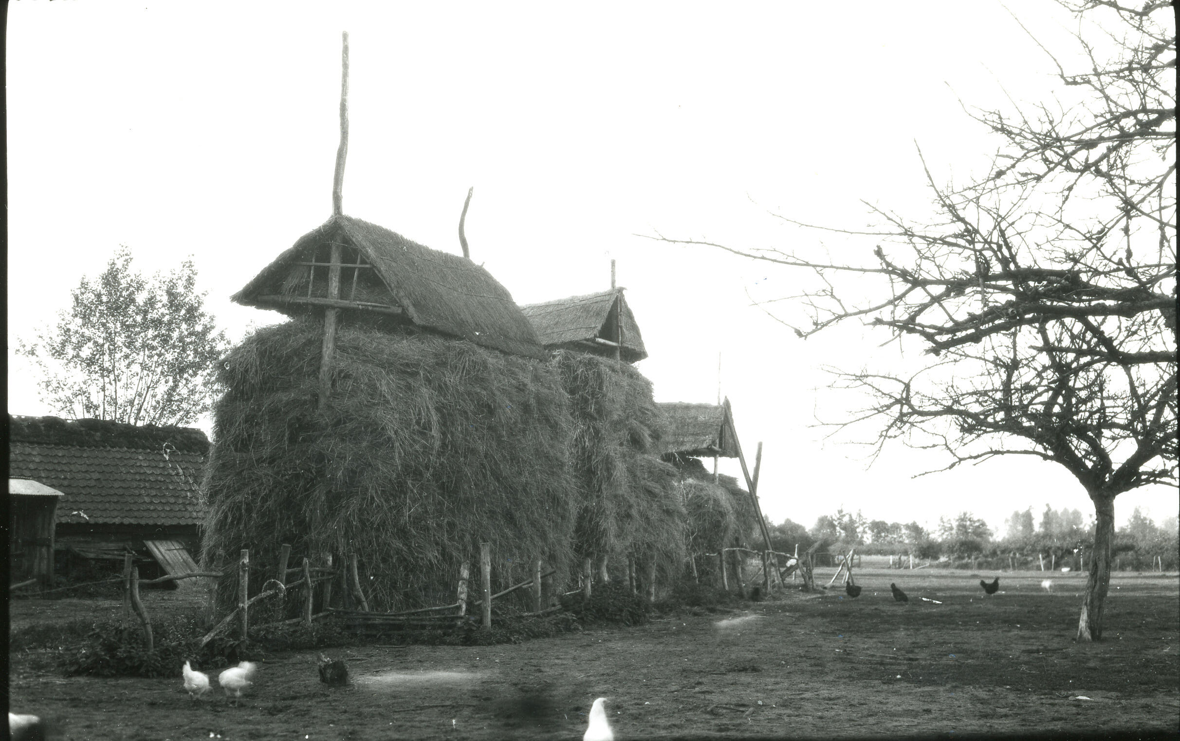 Drie hooibergen op het erf van een boerderij in De Kraats. De tweeroedige kapbergen zijn gevuld met hooi.