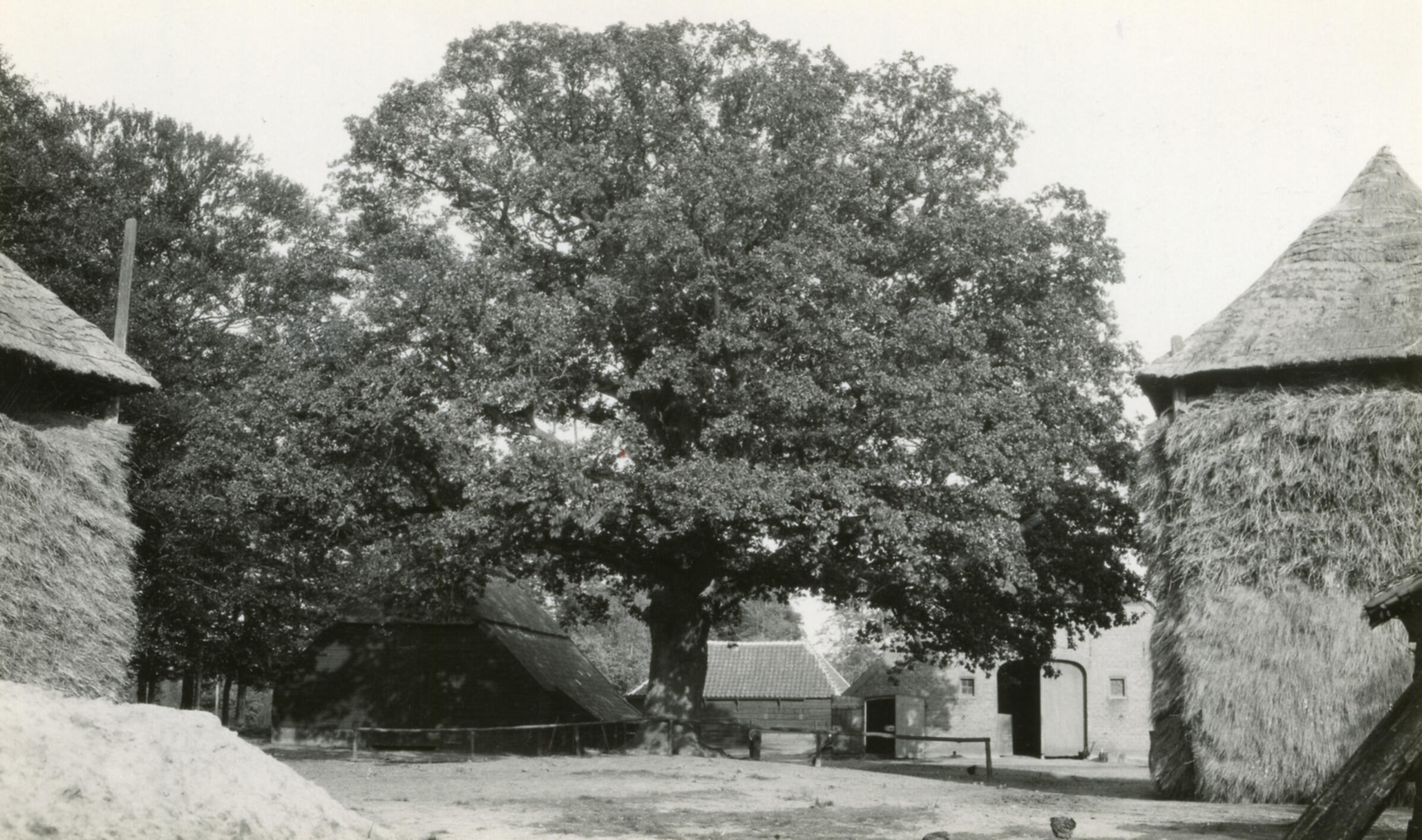 Een boerenerf met hooibergen achter een boerderij in de Doesburgerbuurt, een buurtschap bij Ede. Op het erf staat een grote beukenboom.