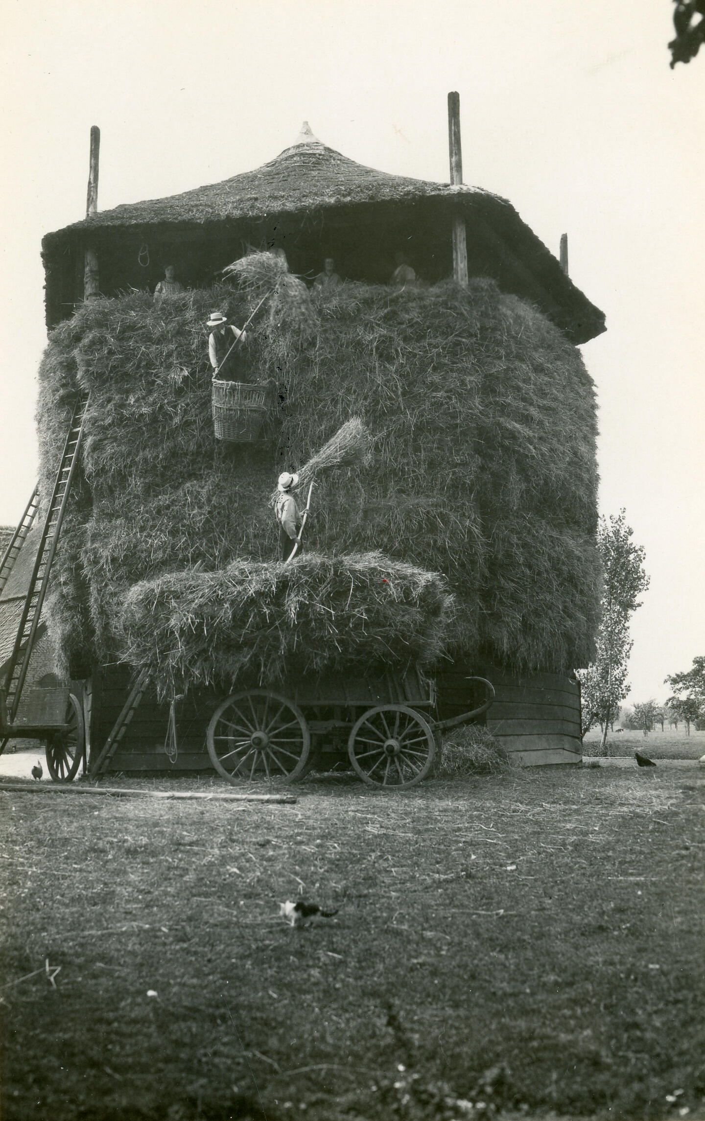 Het optassen van graan in een kapberg bij boerderij 'Wolfskamp' in Hemmen, in de Overbetuwe. Vanaf de wagen worden de garven opgestoken naar de man die halverwege in een mand staat. Deze man steekt de garven verder naar boven op.