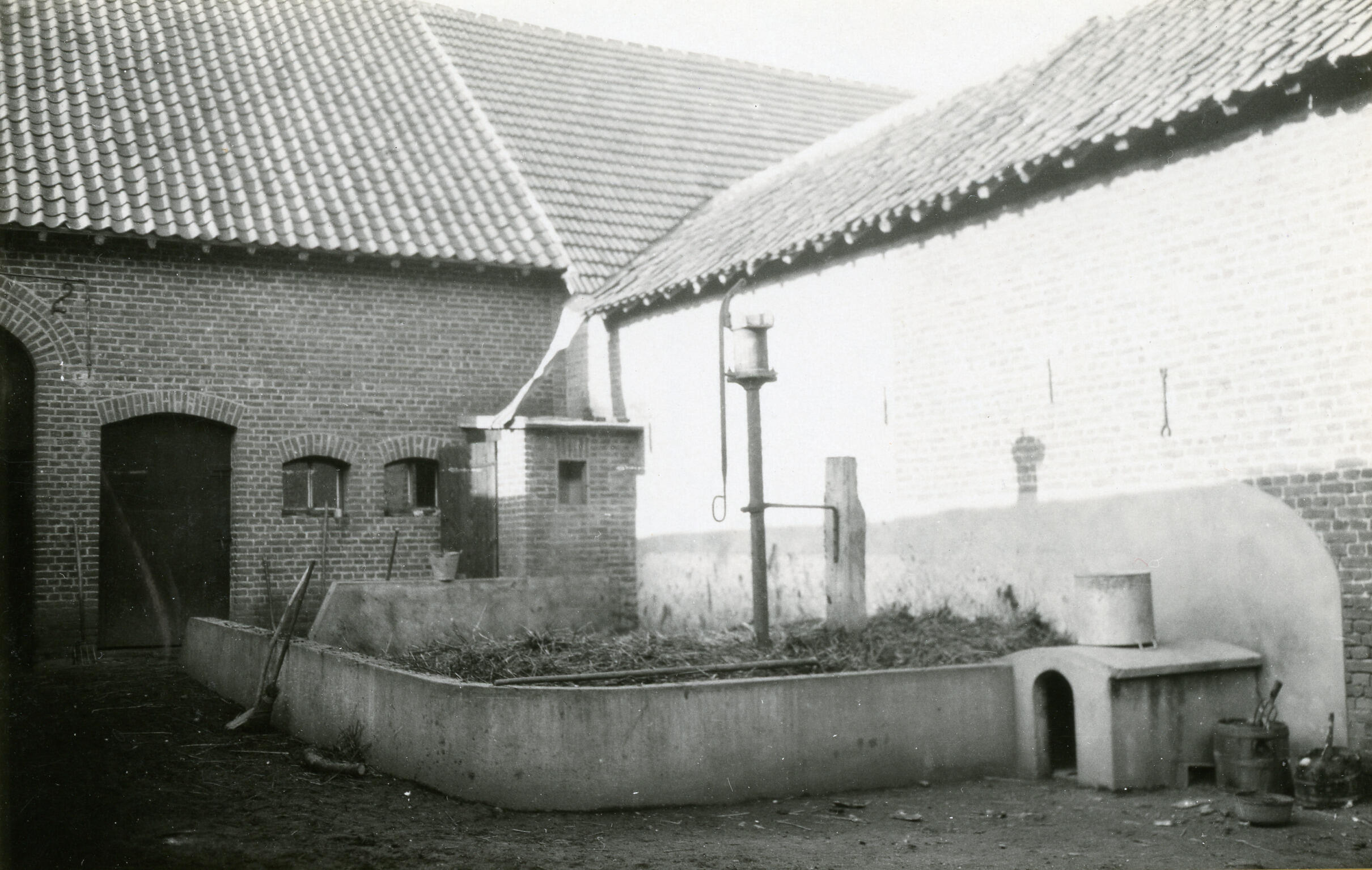 De binnenplaats van een boerderij in Limbricht. Op de binnenplaats ligt een mestvaalt met een gierpomp. Tegen de muur staat een privaat. Rechts staat een hondenhok.