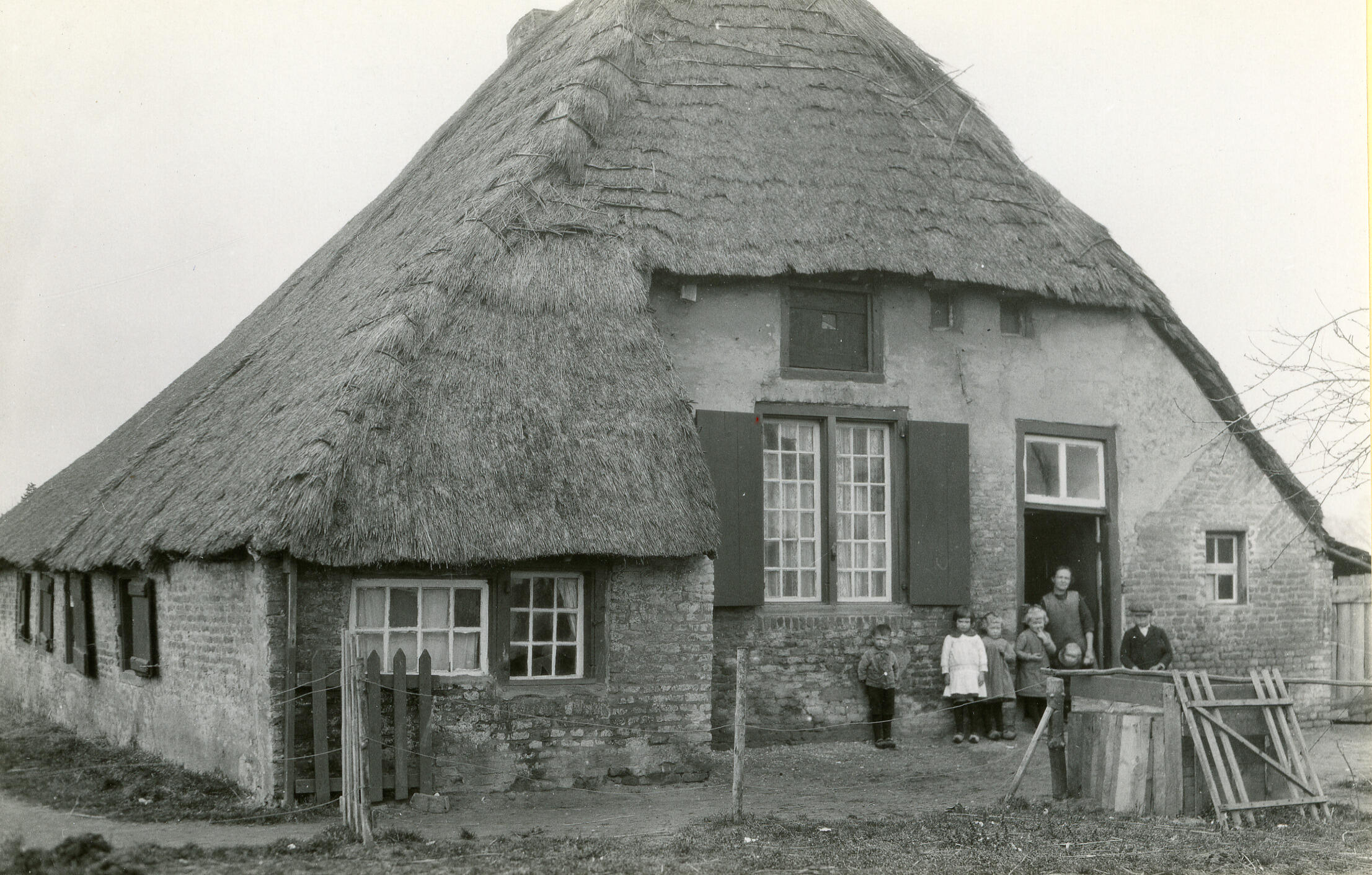 Voorzijde van een boerderij in Gemert. Bij de deuropening poseren een vrouw en zes kinderen.