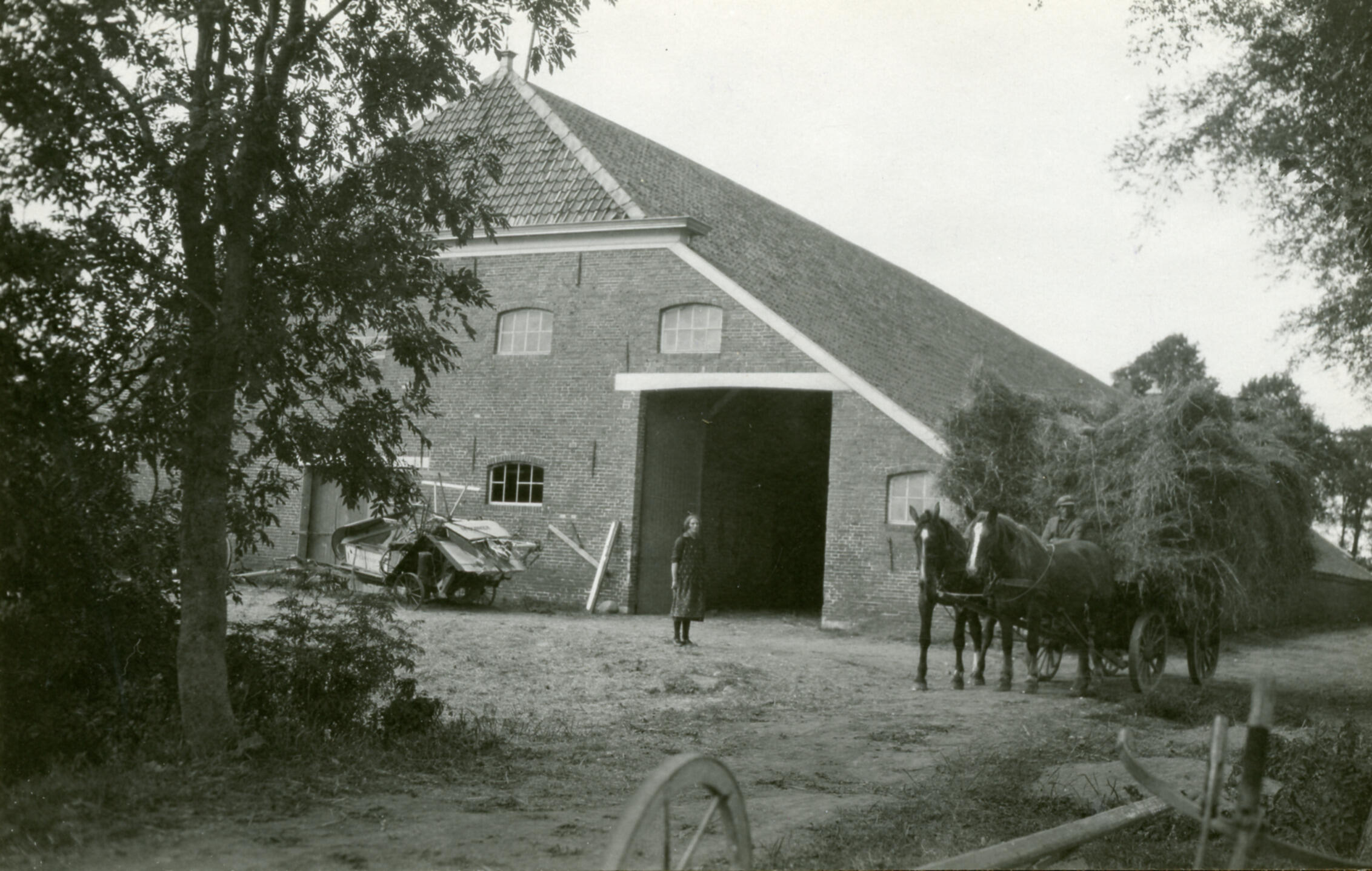 De achterzijde van een boerderij in Midwolda. Achter de boerderij staat een maaimachine. Rechts staat een volgeladen boerenwagen met twee paarden ervoor.