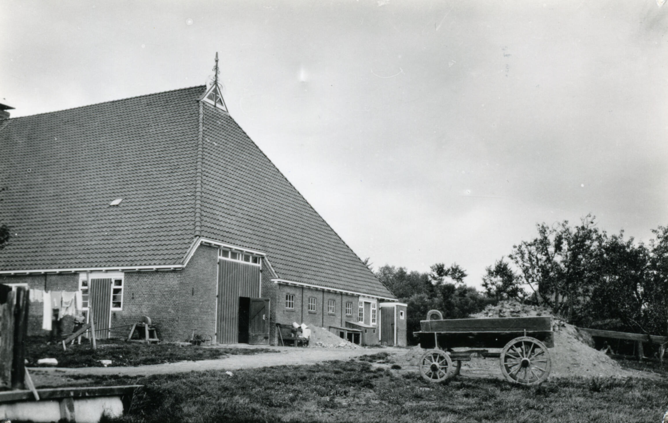 Achterzijde van een boerderij in Roodhuis, een dorp ten noorden van Sneek. Rechts staat een boerenwagen.