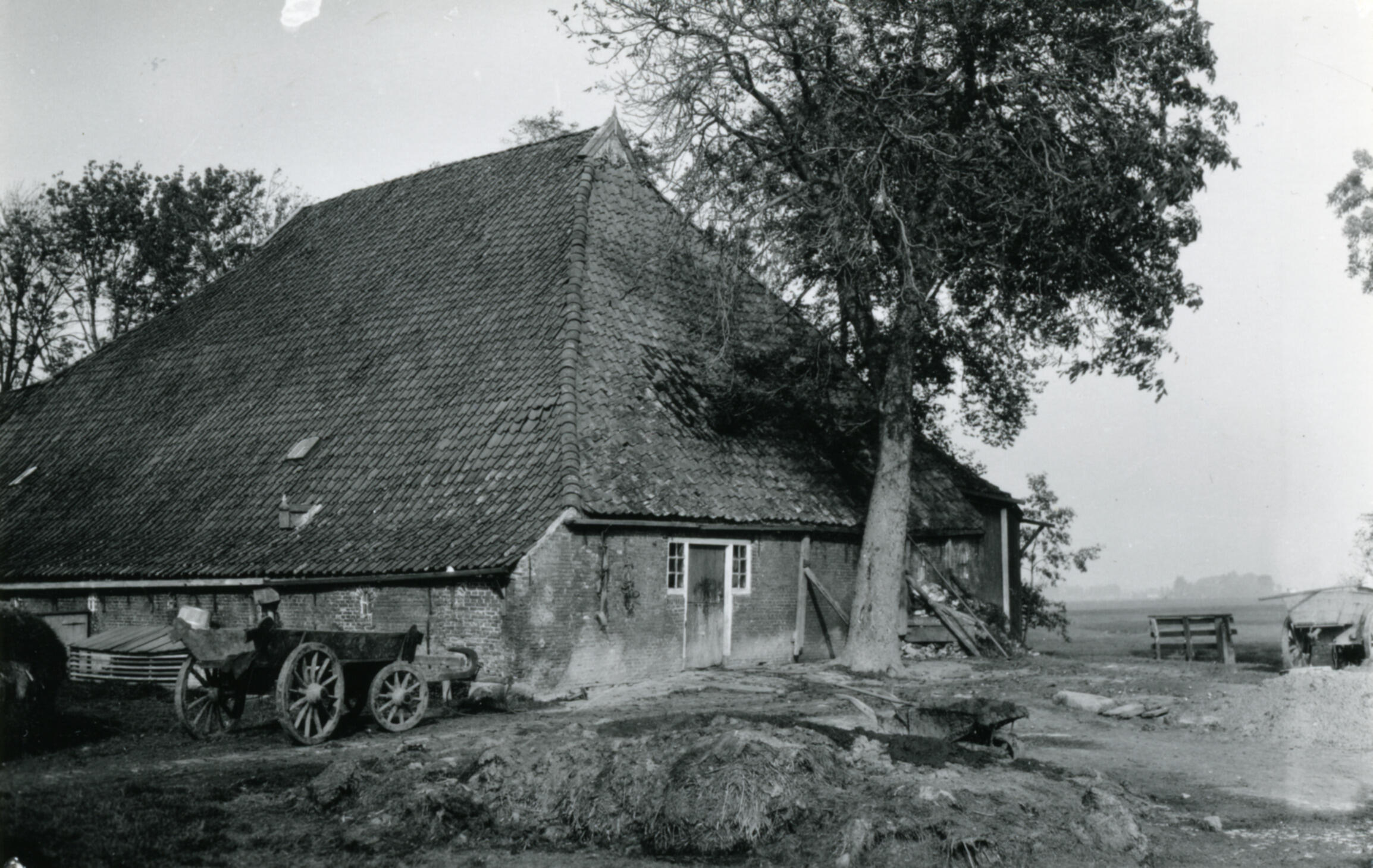 Achterzijde van een boerderij in Goëngamieden, een buurtschap bij Goënga, ten noorden van Sneek. Links staat een boerenwagen.
