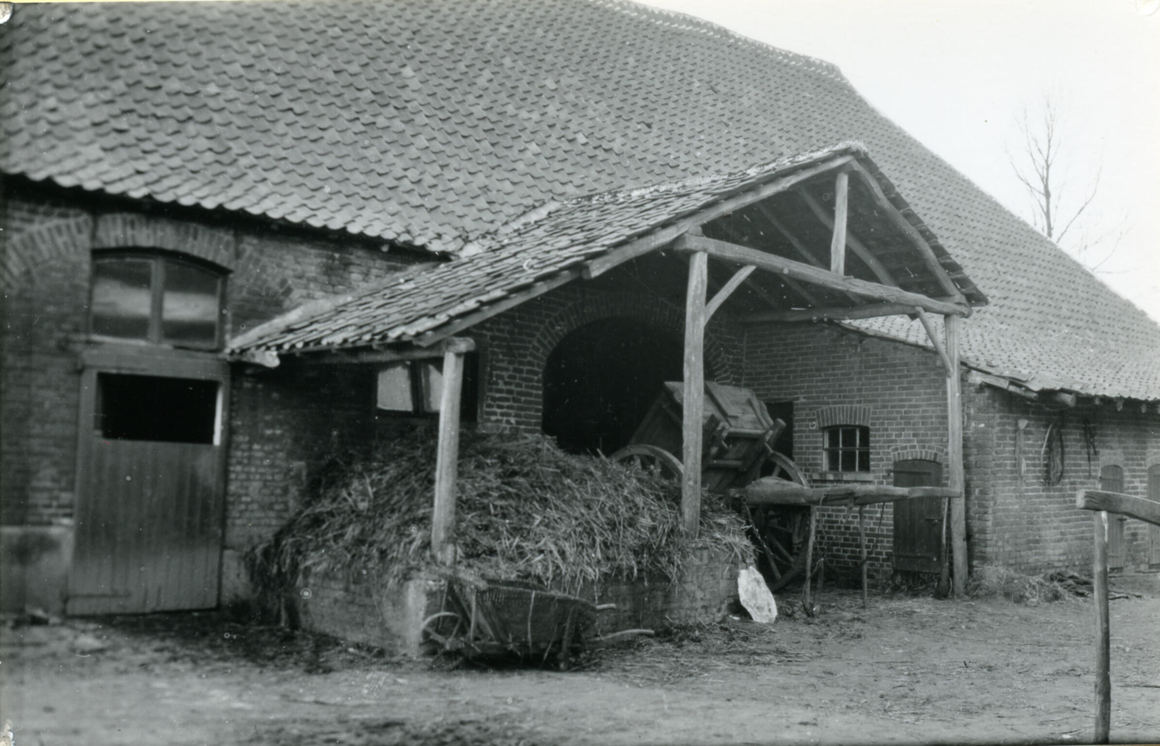 Afdak bij een boerderij in Baexem, een dorp tussen Weert en Roermond. Onder het afdak staat een kar en ervoor staat een kruiwagen.