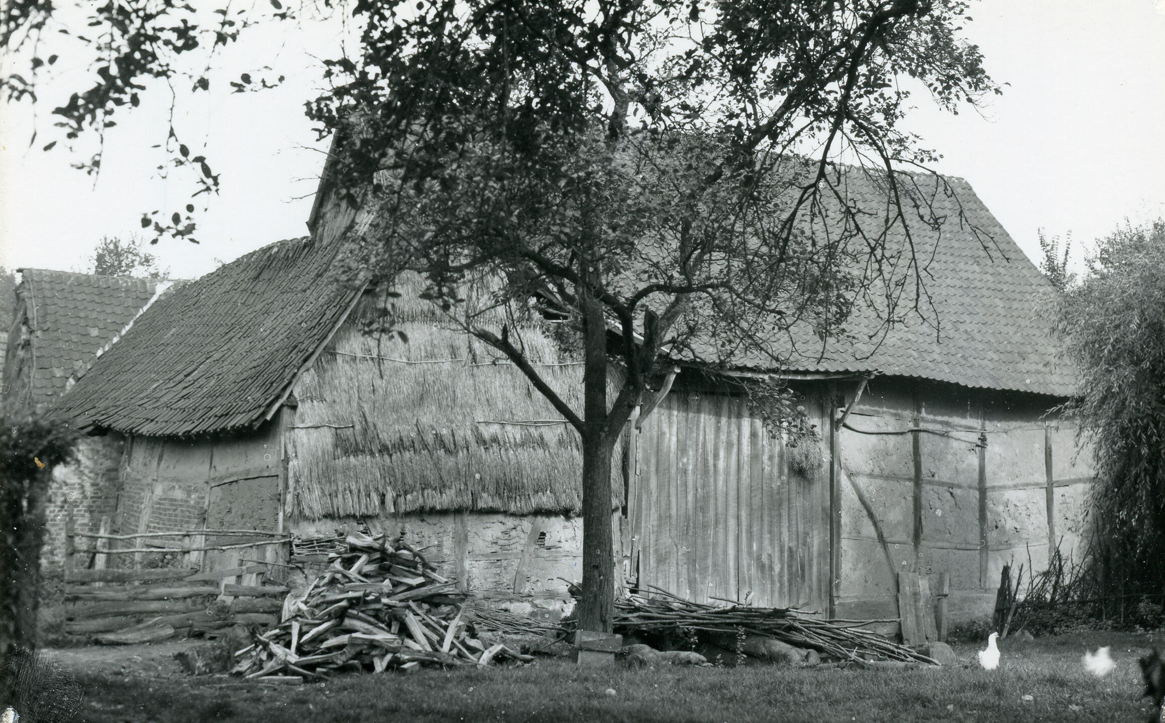 Achterzijde van een boerderij in Ekkelrade. De wanden zijn deels van stro en deels van vakwerk met leem- en baksteenvulling.