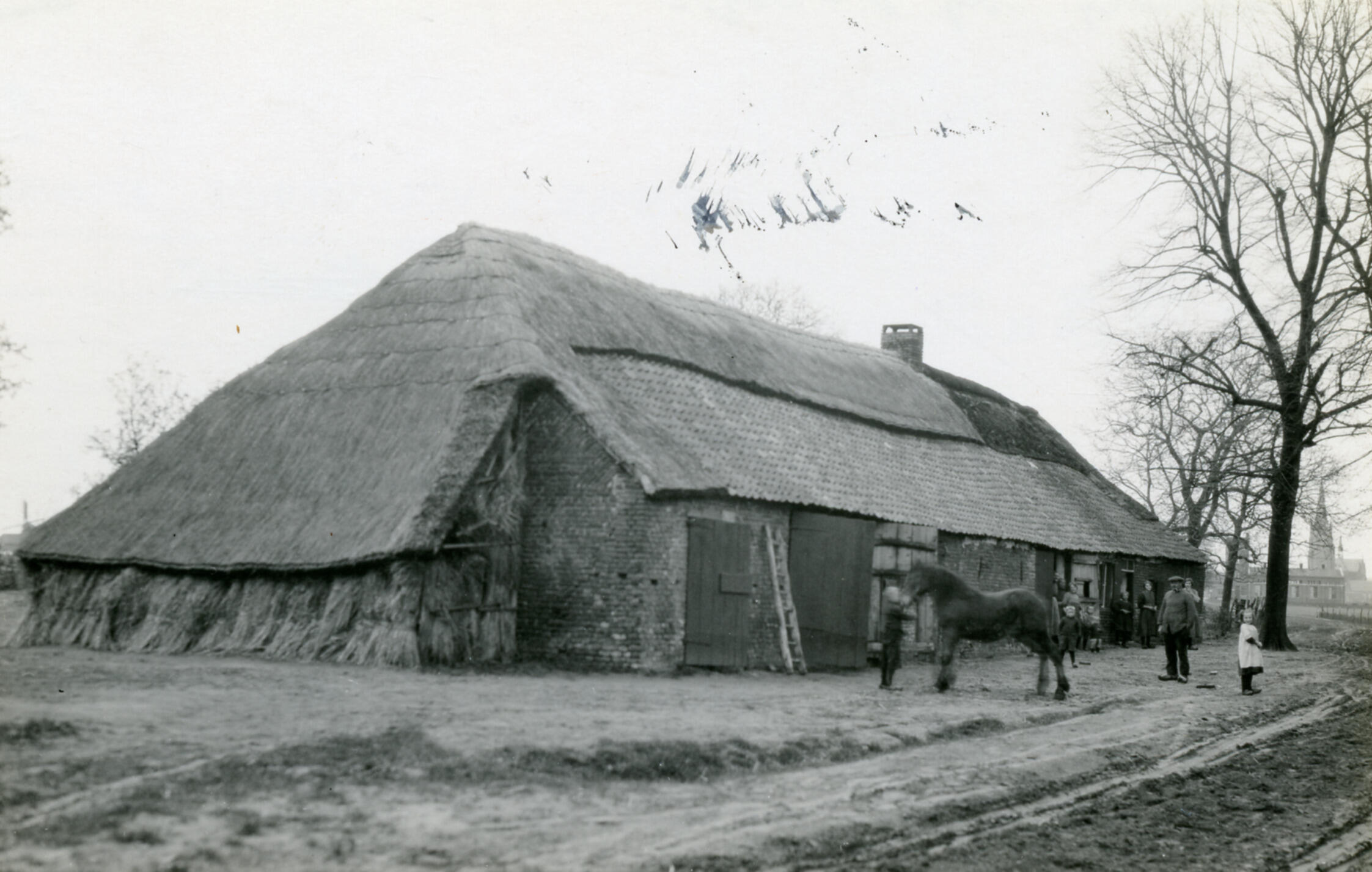 Zijgevel van een boerderij in Meijel, ten noorden van Roermond. Op het erf staat een jongen met een paard.