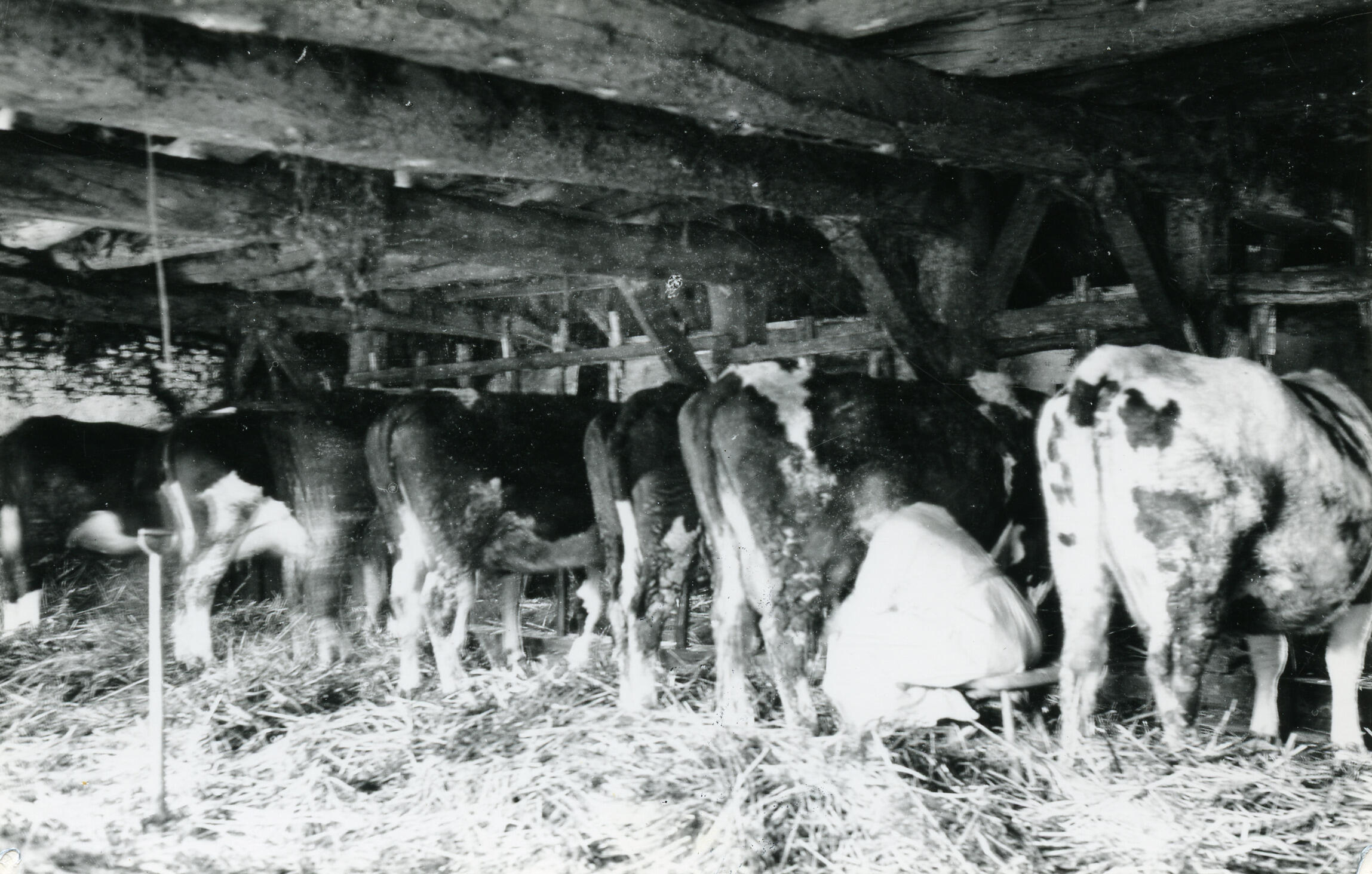 Koeien in een potstal, in een boerderij in Middelbeers. Een vrouw melkt een van de koeien.