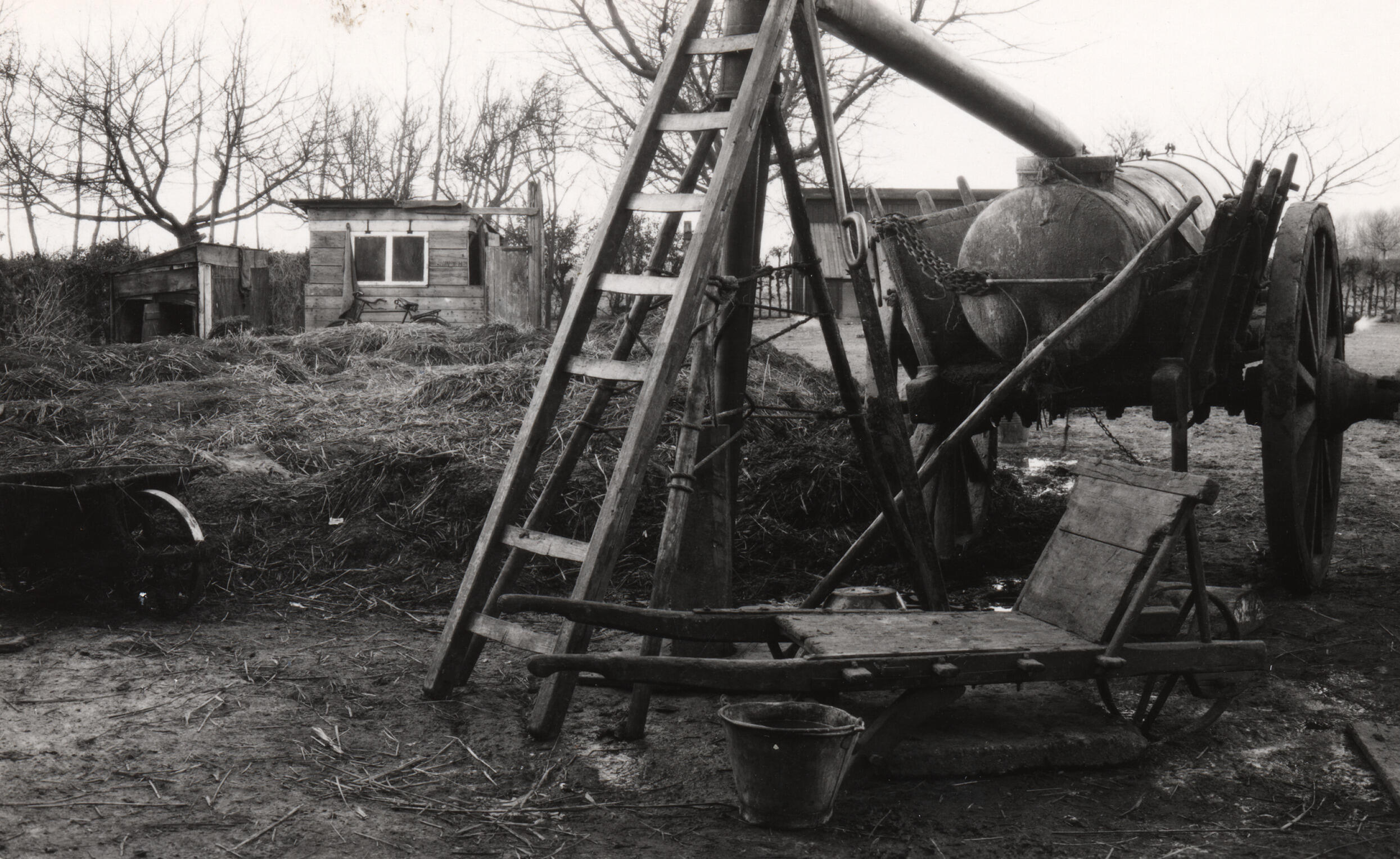 Kruiwagen, waarvan de zijleren zijn afgenomen, gebruikt voor vervoer van stalmest. Daarachter staat een tweewielige stortkar met een verzinkt giervat dat met een gierpomp wordt gevuld, in de Brabantse Kempen (onder Eindhoven).