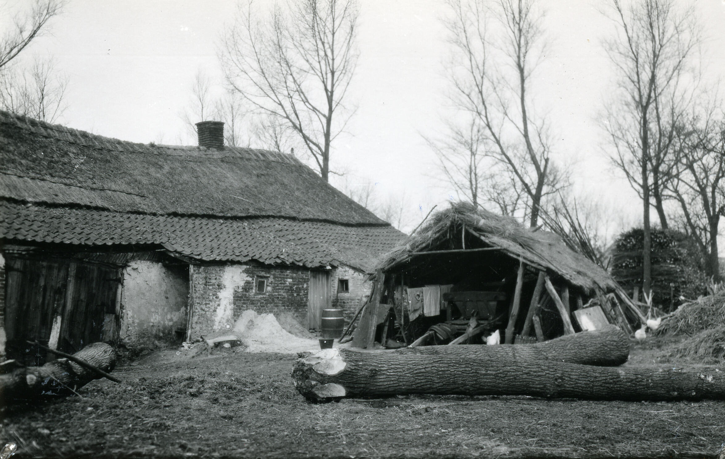 Boerderij in Gemert. Op het erf liggen gevelde bomen.