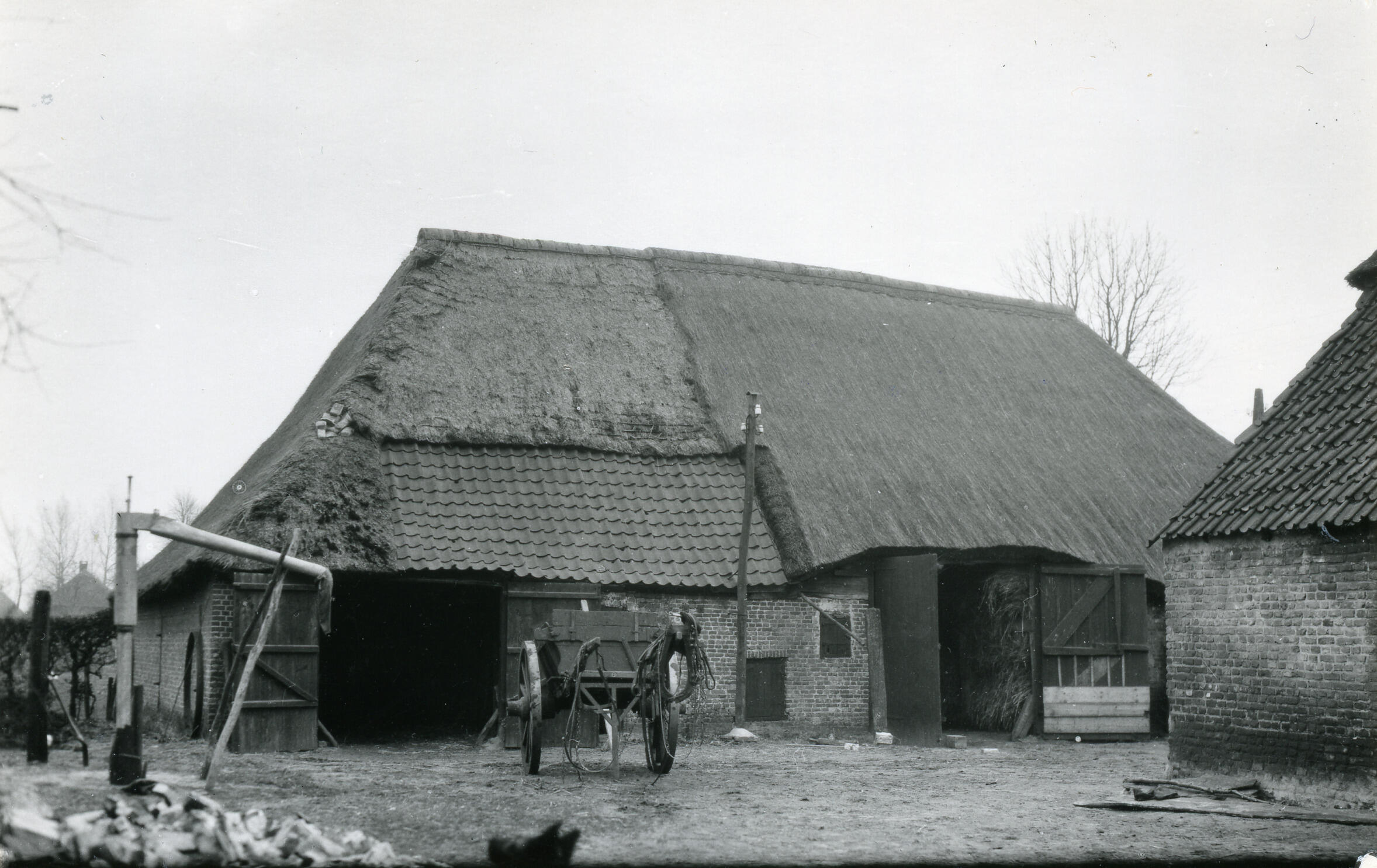 Een schuur bij een boerderij in Gemert. Op het erf staat een kar. Links staat een gierpomp.