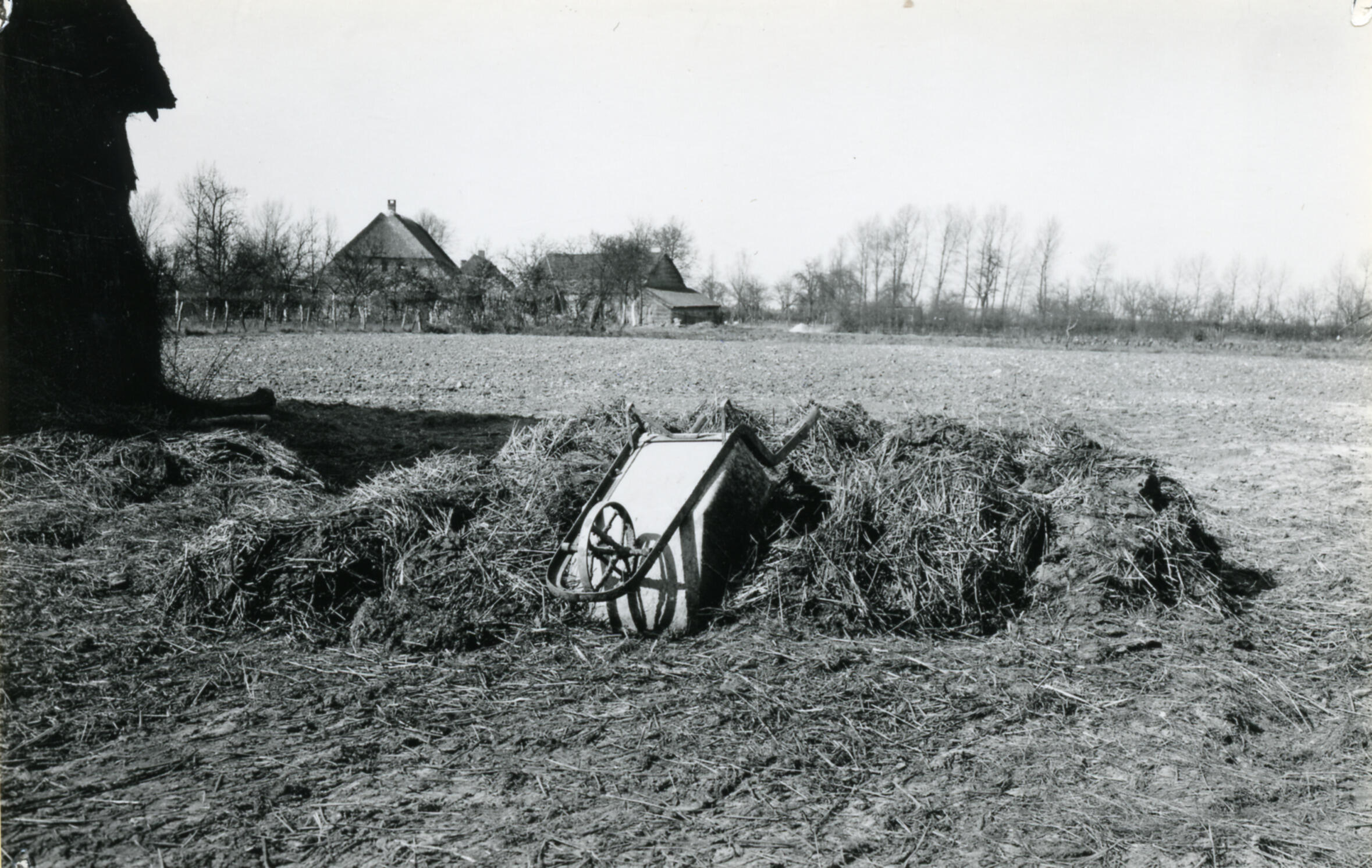 Mestvaalt op het erf van een boerderij in Waalre. Op de mesthoop ligt een kruiwagen. De foto is door Van Houten gemaakt als voorbeeld van een slecht opgezette mesthoop.
