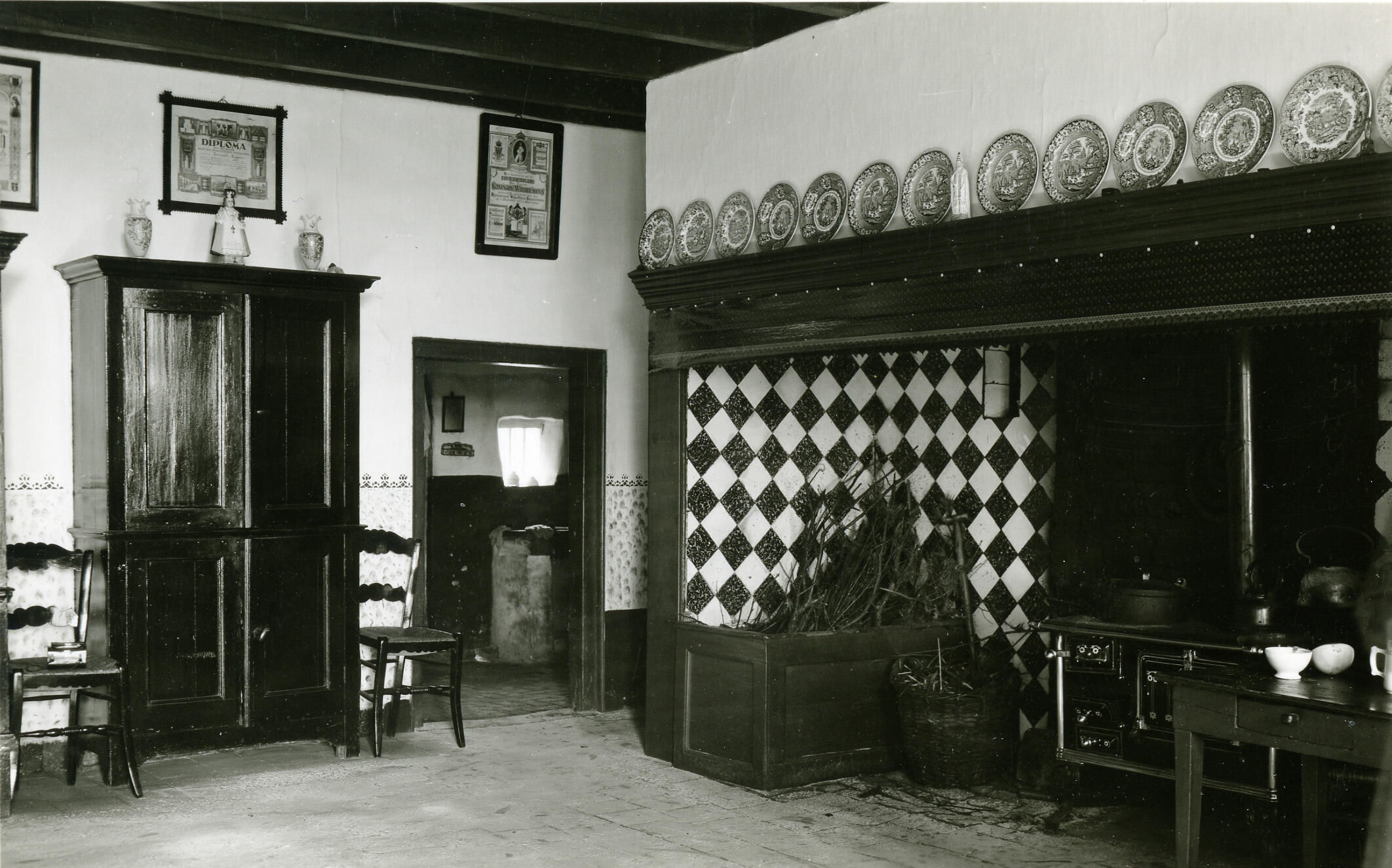 Interieur van de keuken van een boerderij in Helvoirt. Rechts is een schouw, met daaronder een fornuiskachel. Op de schouwrand staat een rij borden met verschillende drukdecors.