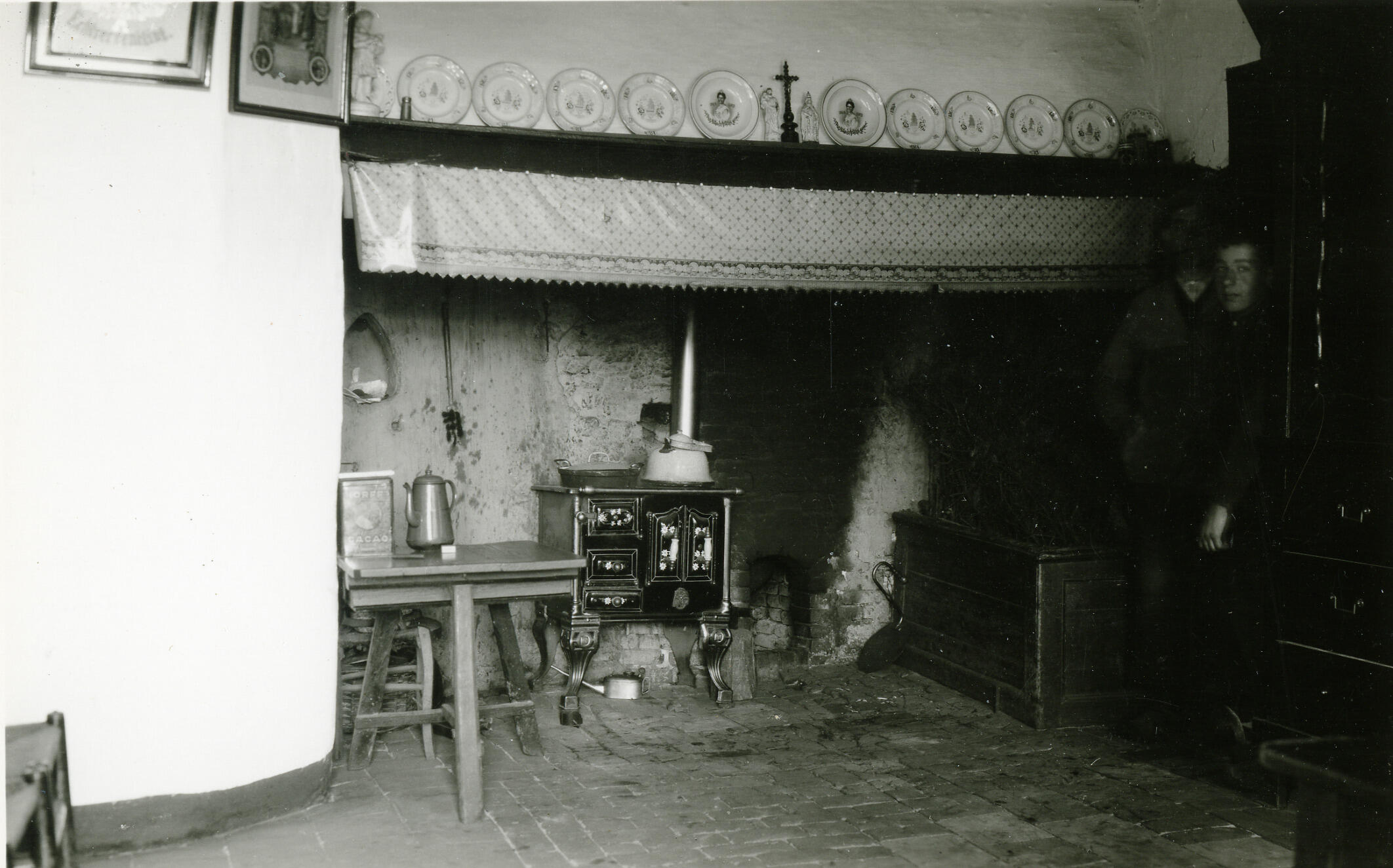 Schouw in de keuken van boerderij 'Langenberg' in Helvoirt. Onder de schouw staat een fornuiskachel. Op de schouwrand staan een kruisbeeld, twee heiligenbeeldjes en een rij borden.