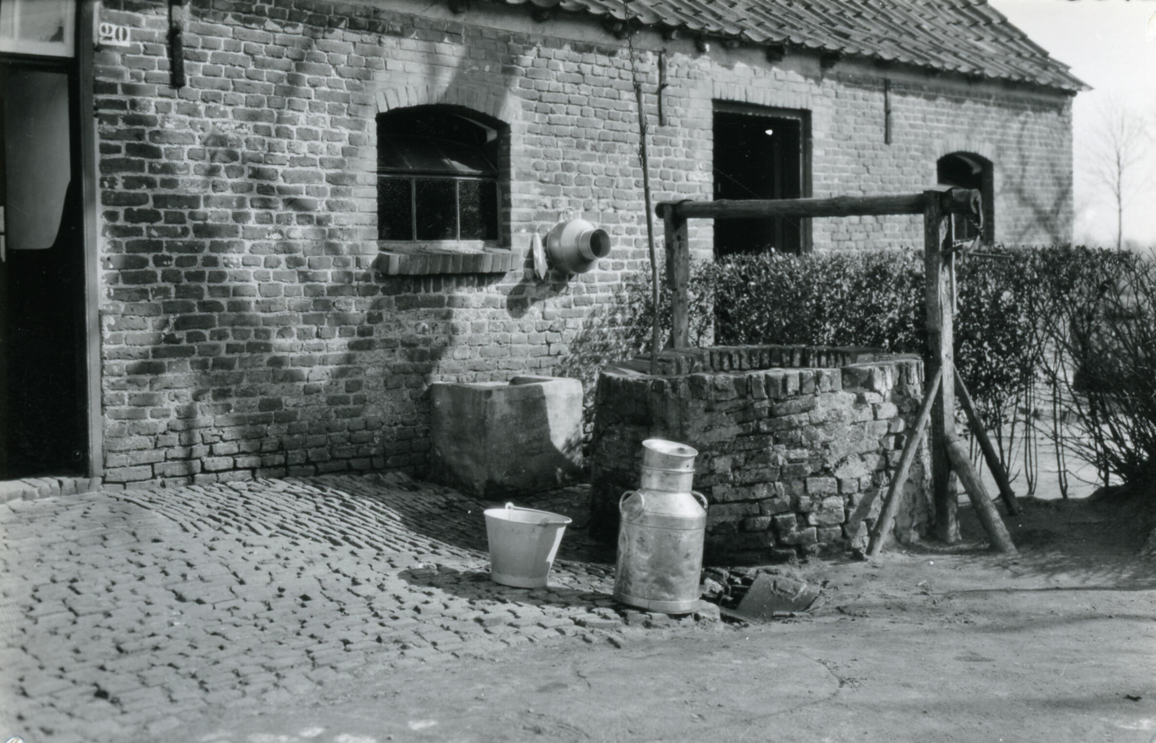 Een waterput bij een boerderij in Woensel. Naast de waterput staat een melkbus.