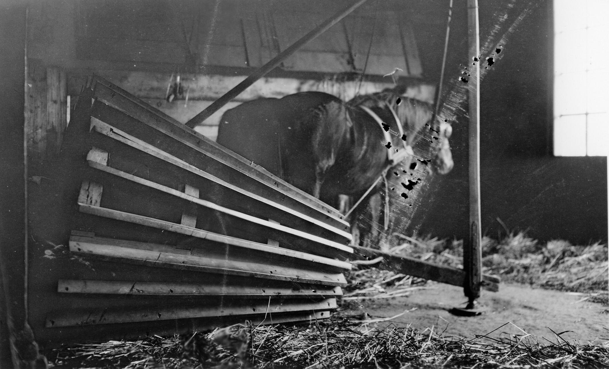 Dorsen met een dorsrol in een boerderij in Sint Annaparochie. Voor de dorsrol zijn twee paarden ingespannen.