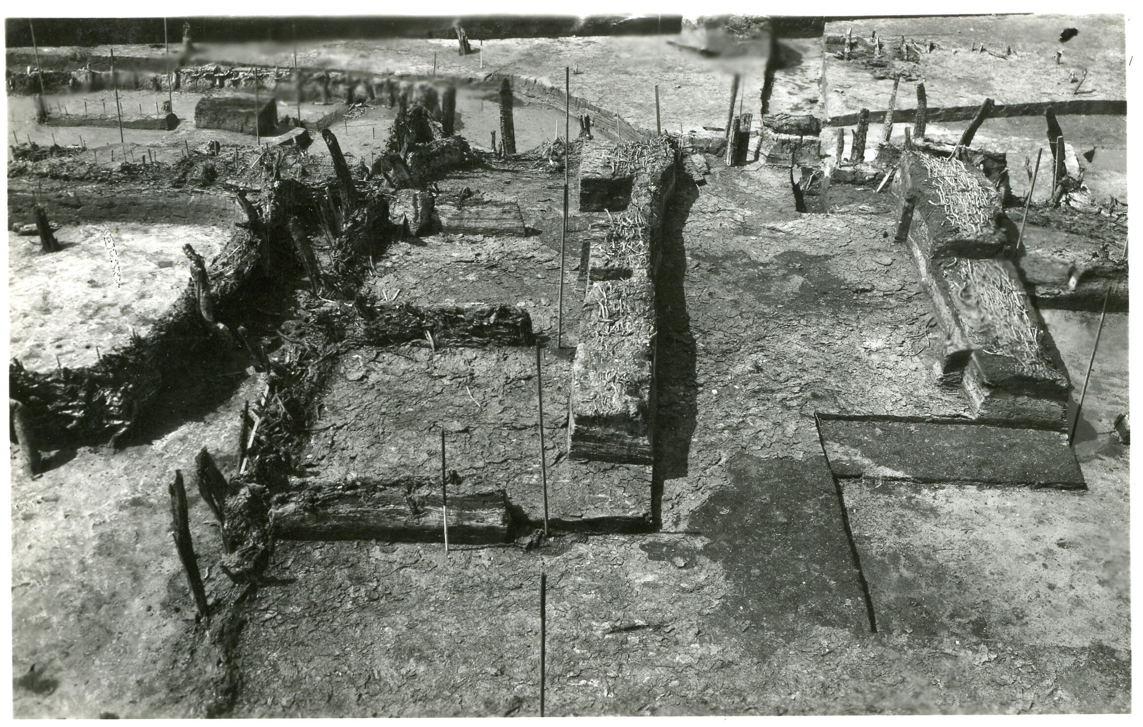 De resten van gebouwen die gevonden zijn tijdens de afgraving van de terp waarop het dorp Ezinge ligt. In Groningen worden terpen wierden genoemd. Afgegraven wierdegrond werd verkocht om te gebruiken als bodemverbeteraar op arme zandgronden. Archeoloog Albert Egges van Giffen (1884-1973) van de Rijksuniversiteit Groningen heeft van 1923 tot 1934 archeologisch onderzoek uitgevoerd bij ...